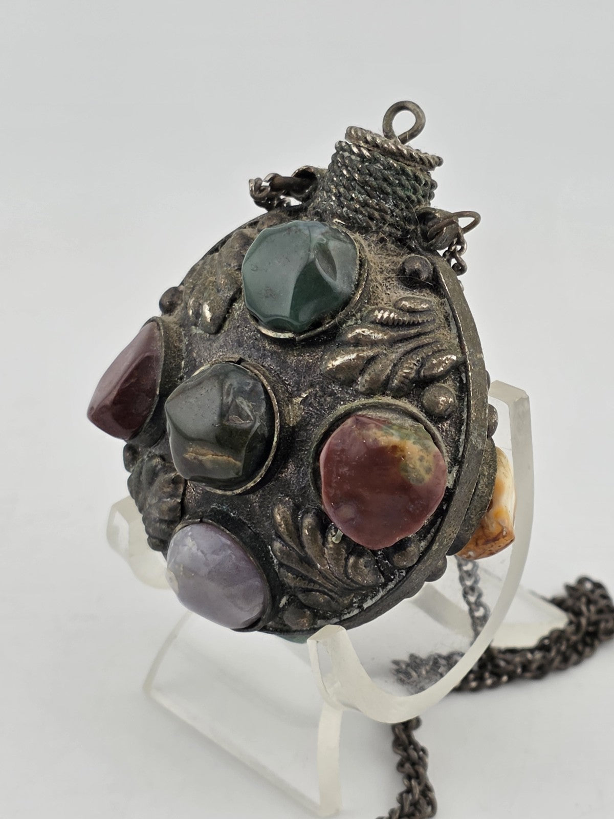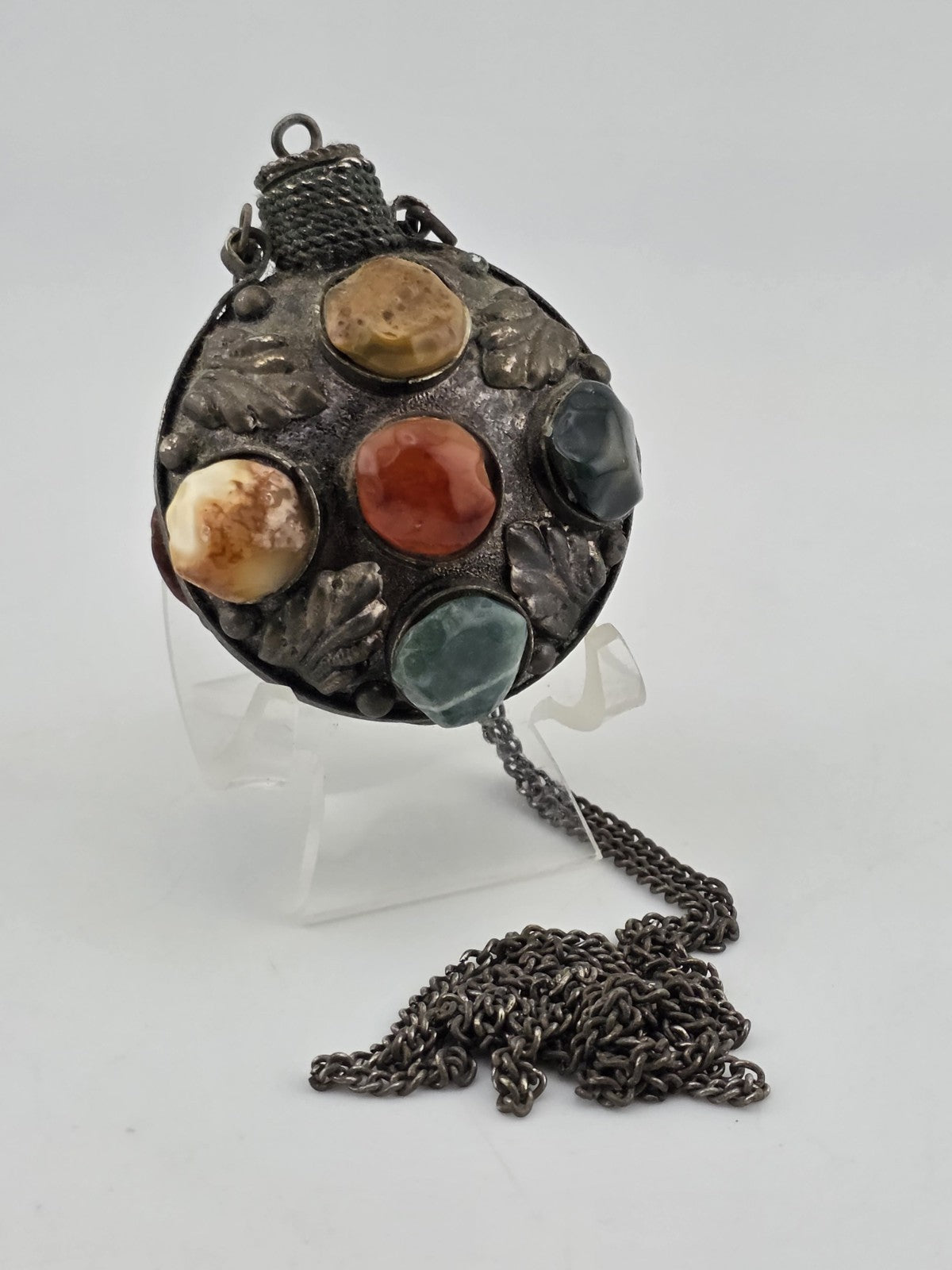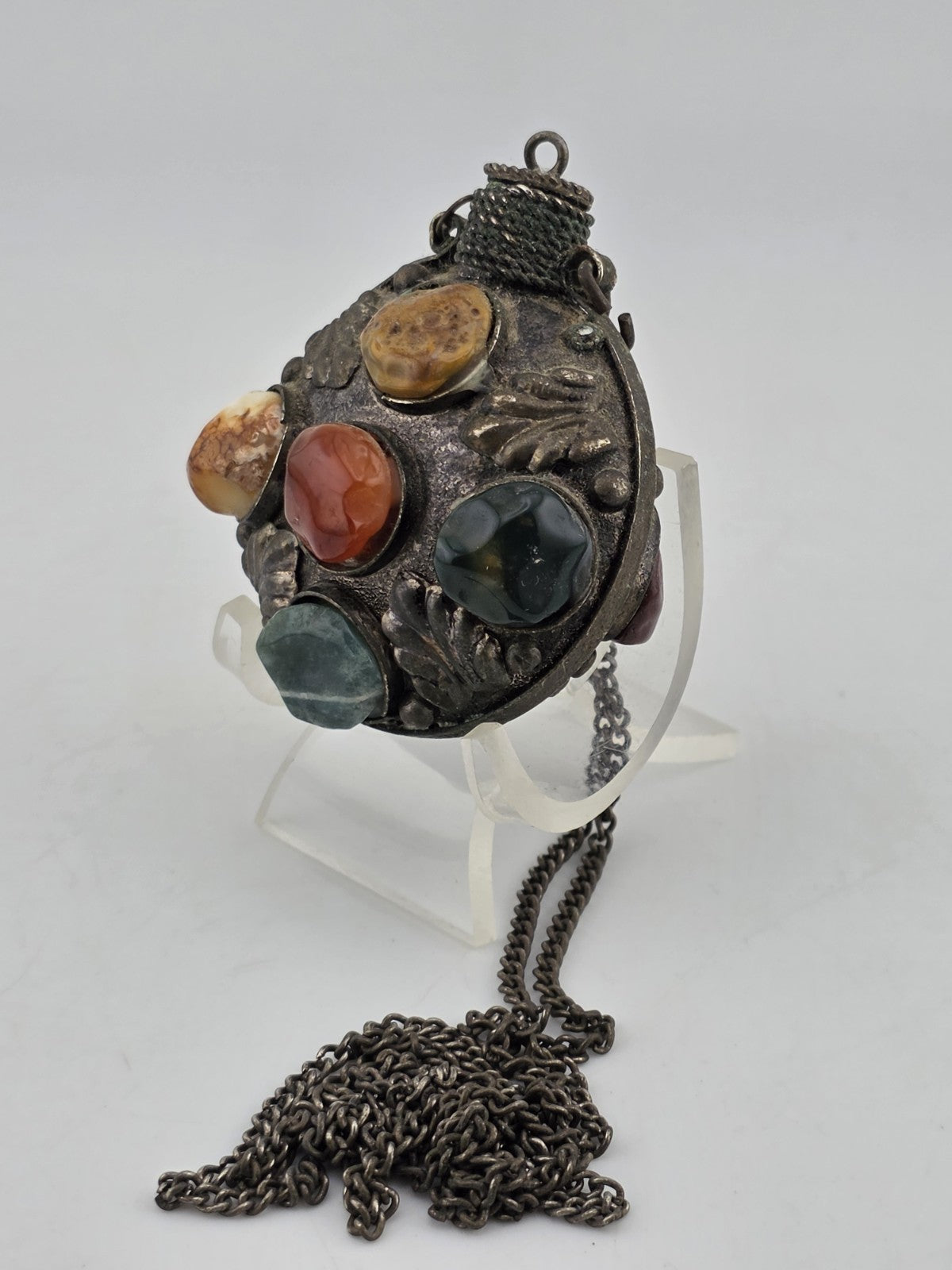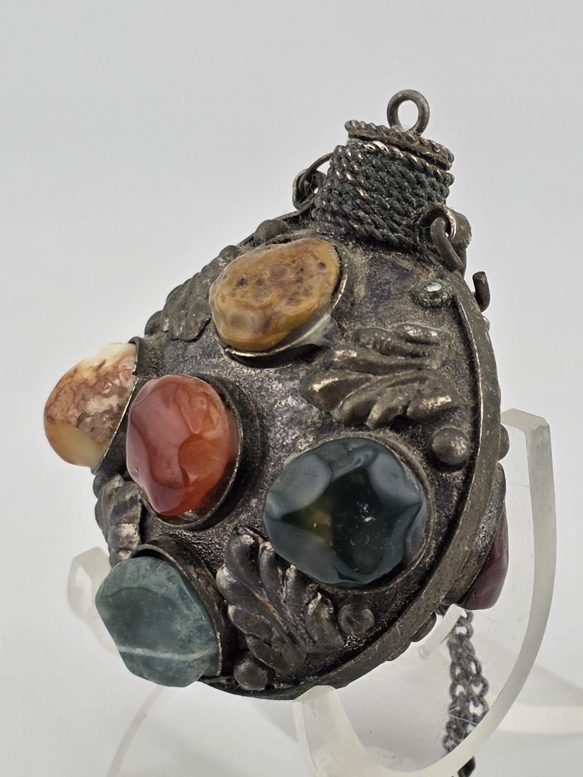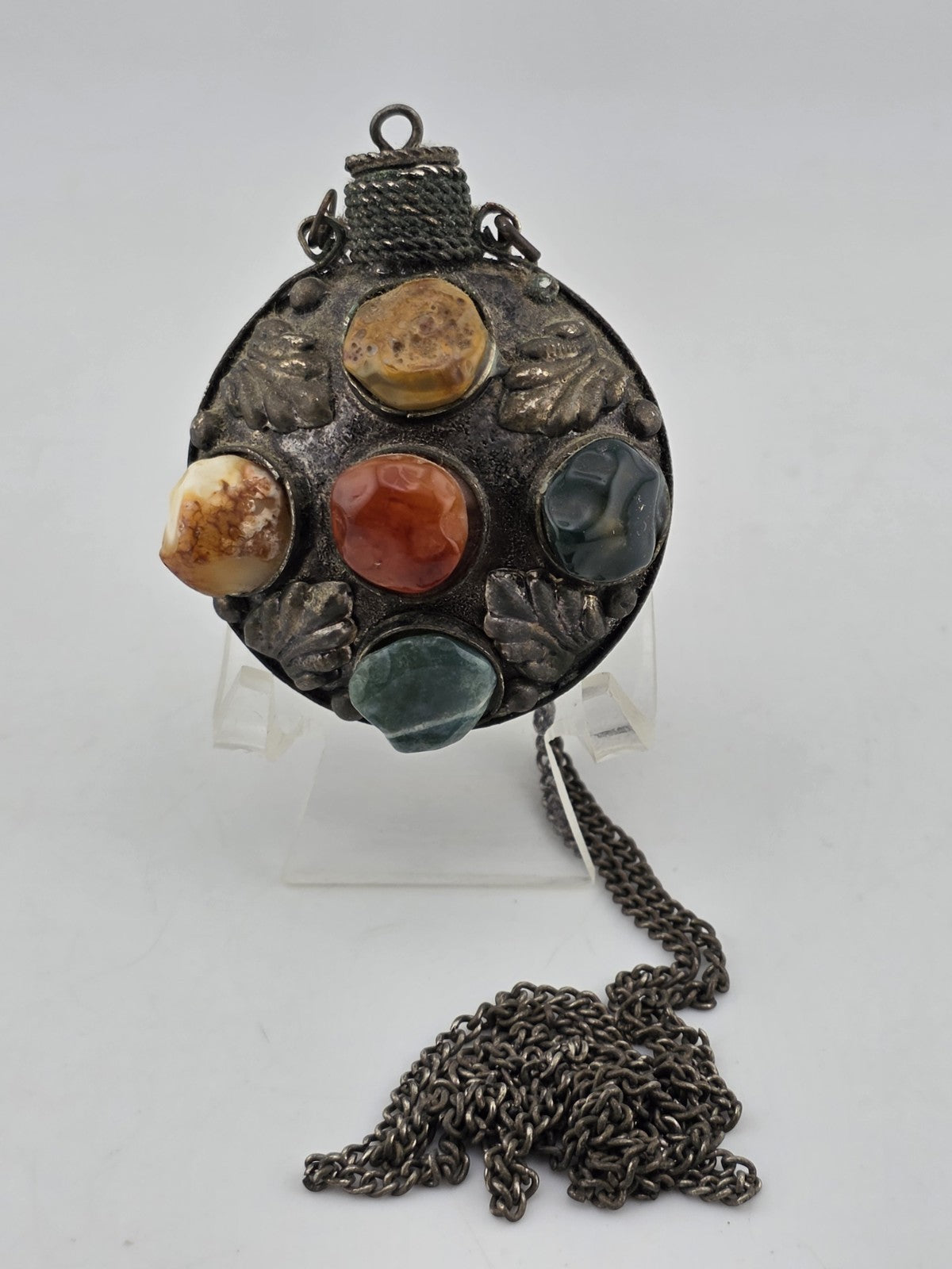 xThis Antique 1900 Imperial Russian Brass & Stone Perfume Bottle Vial Pendant Necklace is a unique and elegant piece of vintage jewelry. The pendant features a small perfume bottle made of brass and adorned with various stones, reflecting the intricate craftsmanship and design of the early 1900s. The necklace adds a touch of nostalgia and sophistication to any outfit, making it a timeless accessory for those who appreciate historical and classic style.