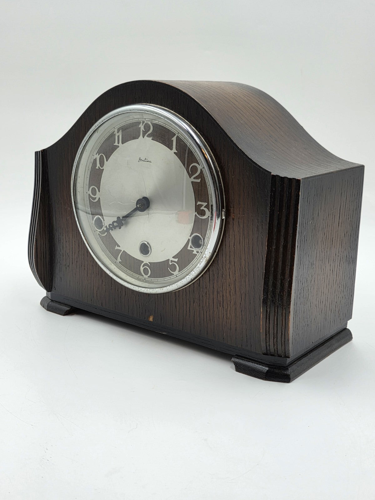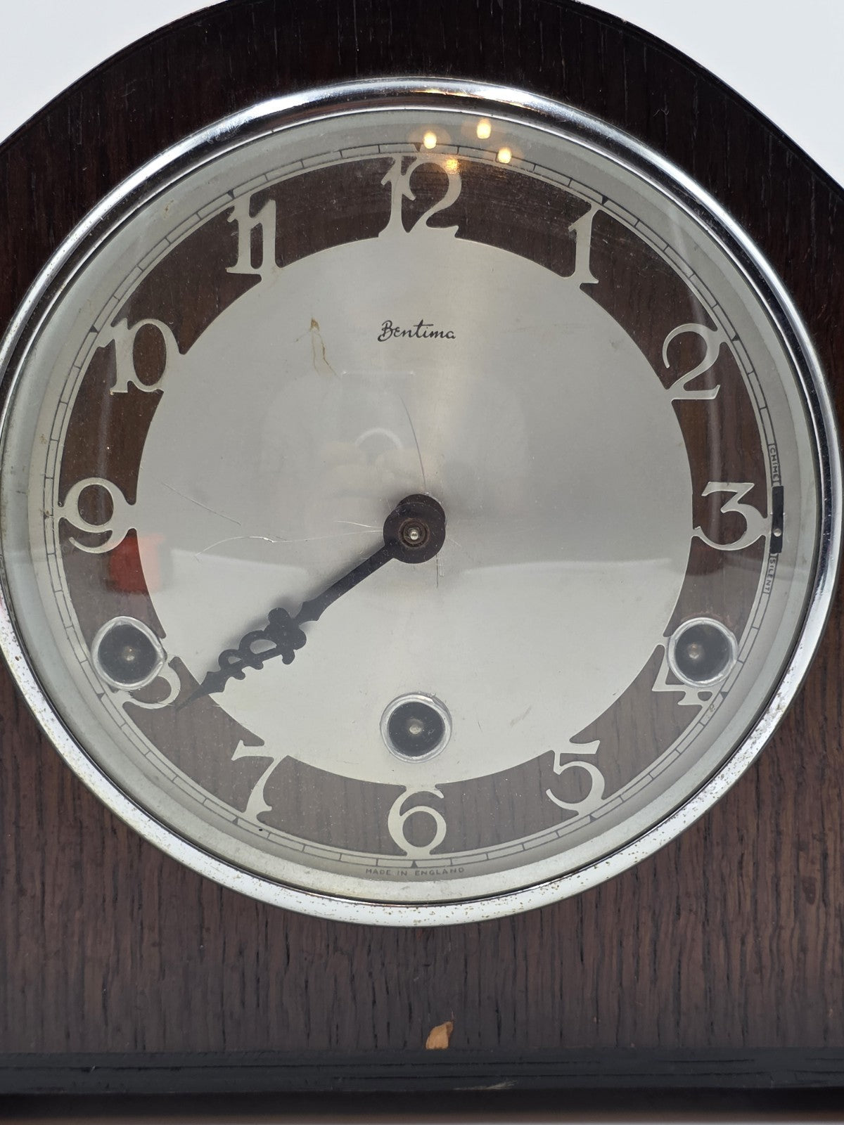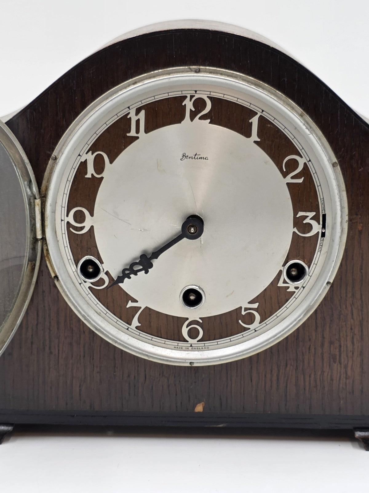 xThe Antique British Bentima Westminster Clock is a beautifully crafted desk clock from the mid 20th century, featuring a classic Art Deco style. Made of wood, glass, and metal, this clock is a vintage piece that exudes elegance and sophistication. With a mechanical movement and powered by wind-up, this clock is not only functional but also adds a touch of vintage charm to any space. Its distinctive chime sequence, Westminster, adds to its nostalgic appeal, making it a desirable collectible for clock enthusiasts and collectors alike.
