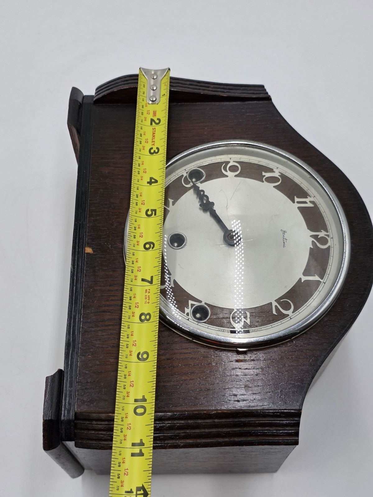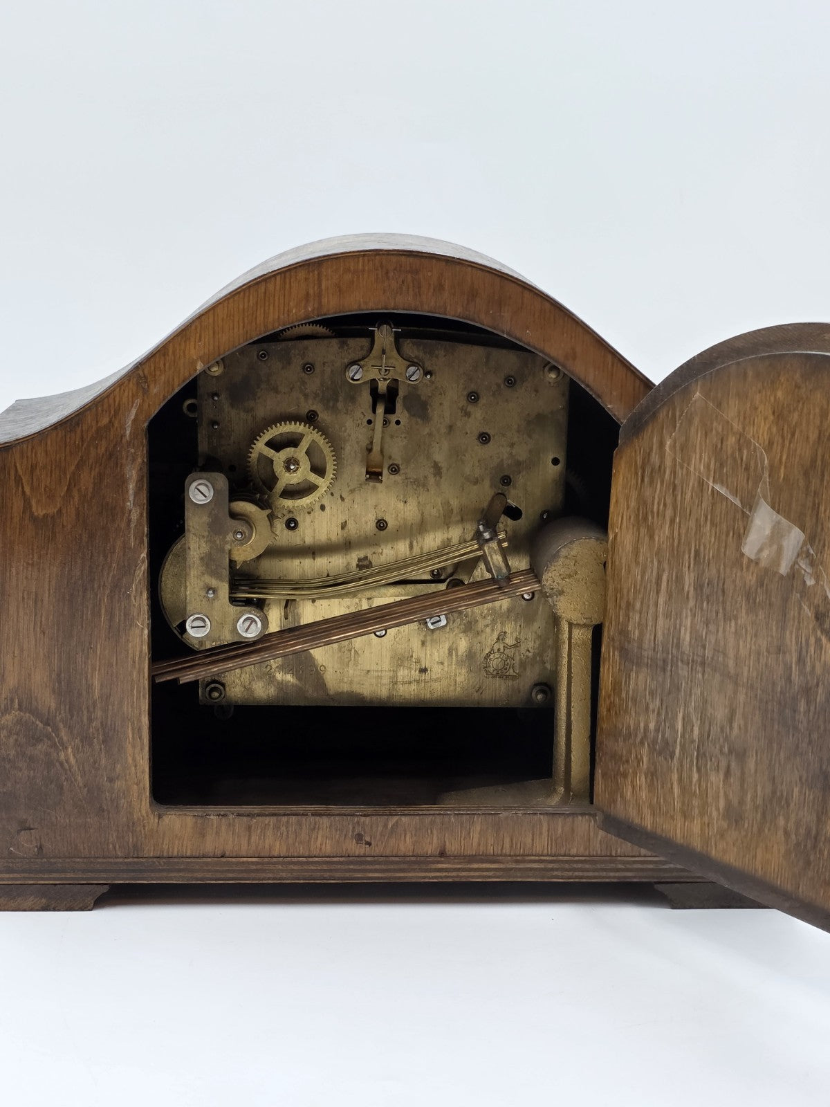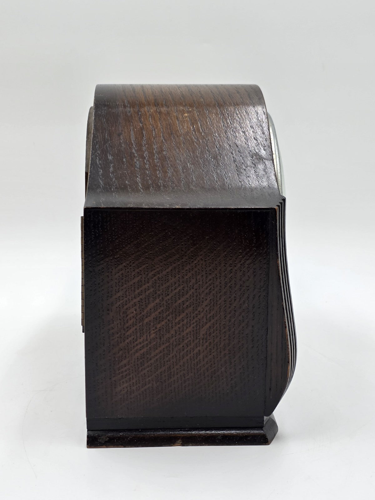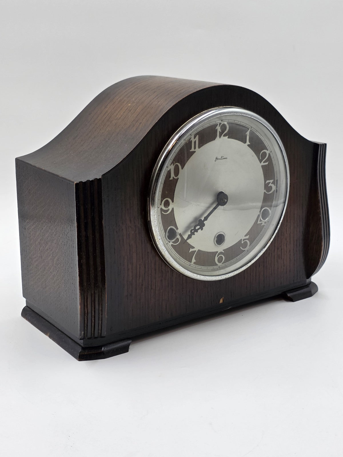 xThe Antique British Bentima Westminster Clock is a beautifully crafted desk clock from the mid 20th century, featuring a classic Art Deco style. Made of wood, glass, and metal, this clock is a vintage piece that exudes elegance and sophistication. With a mechanical movement and powered by wind-up, this clock is not only functional but also adds a touch of vintage charm to any space. Its distinctive chime sequence, Westminster, adds to its nostalgic appeal, making it a desirable collectible for clock enthusiasts and collectors alike.