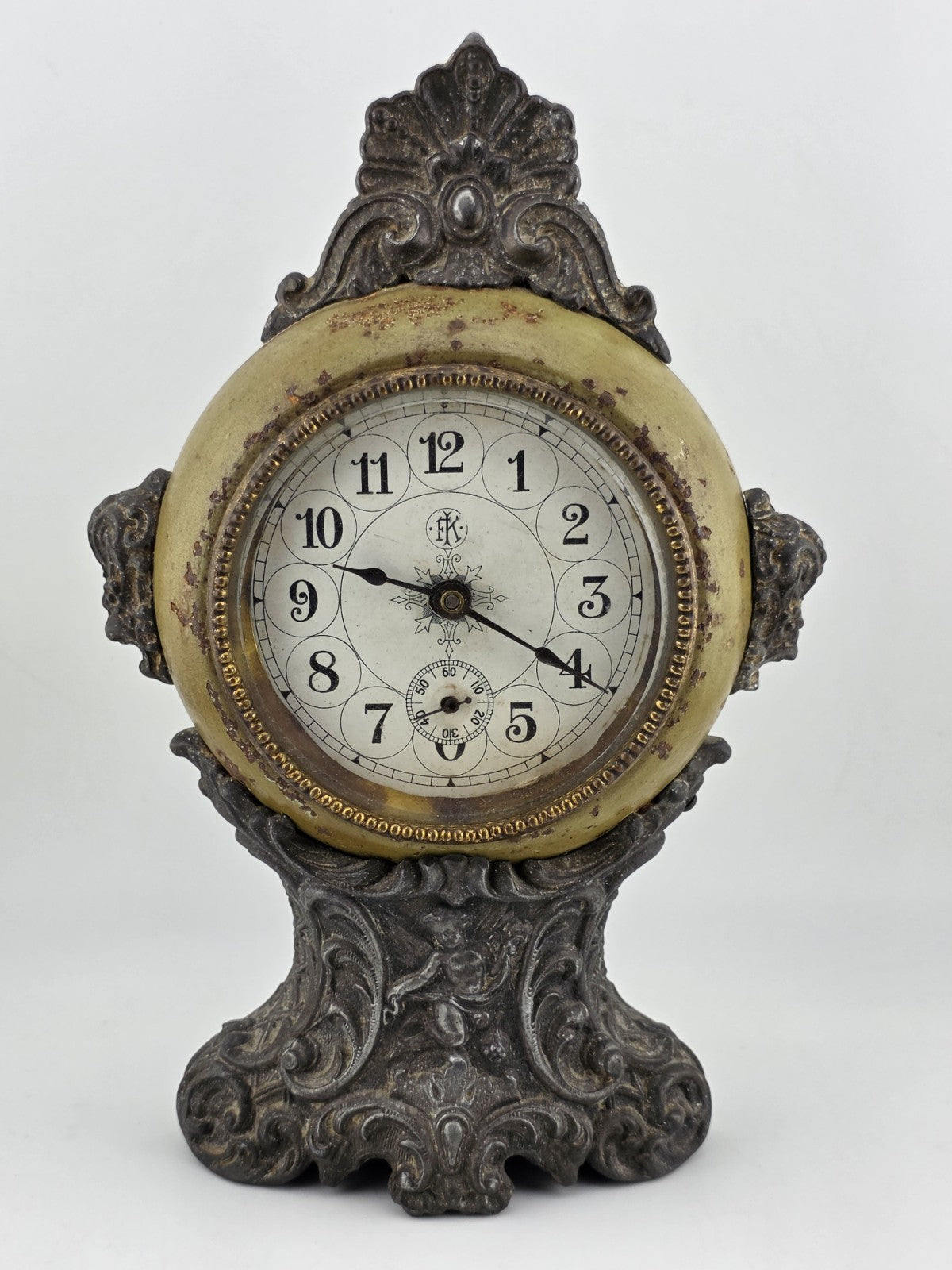 xThe Antique F. Kroeber Metal Mantel Alarm Clock from c.1893 is a beautifully crafted Victorian desk clock with a windup mechanical movement. Featuring a multicolor brass and metal construction, this ornate clock exudes vintage charm and style. The alarm feature adds functionality to this collectible piece, making it not only a decorative item but also a practical timekeeping tool. Perfect for antique collectors or those looking to add a touch of Victorian elegance to their home or office decor.