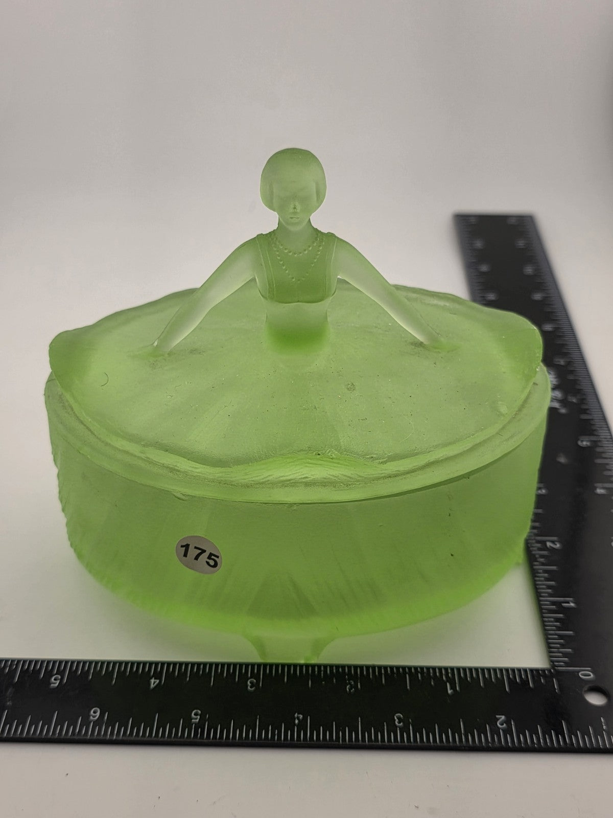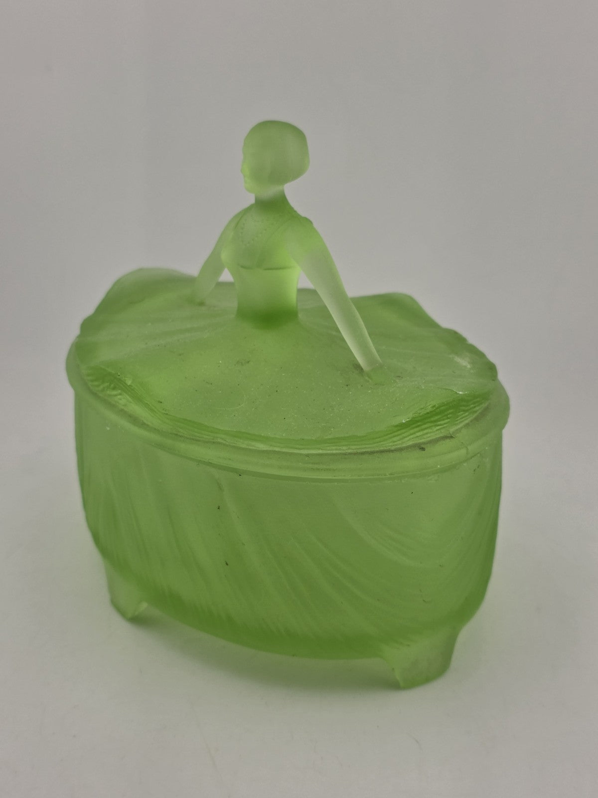 xThis Antique Victorian Lady Uranium Vaseline Glass Trinket Powder Jar Box With Lid is a rare and unique collectible item made of glass. The distinctive Uranium content in the glass gives it a beautiful and vibrant glow, adding to its charm and allure. This piece exudes a sense of elegance and nostalgia, perfect for collectors of vintage and antique items or those who appreciate unique and rare pieces for their vanity or dressing table.