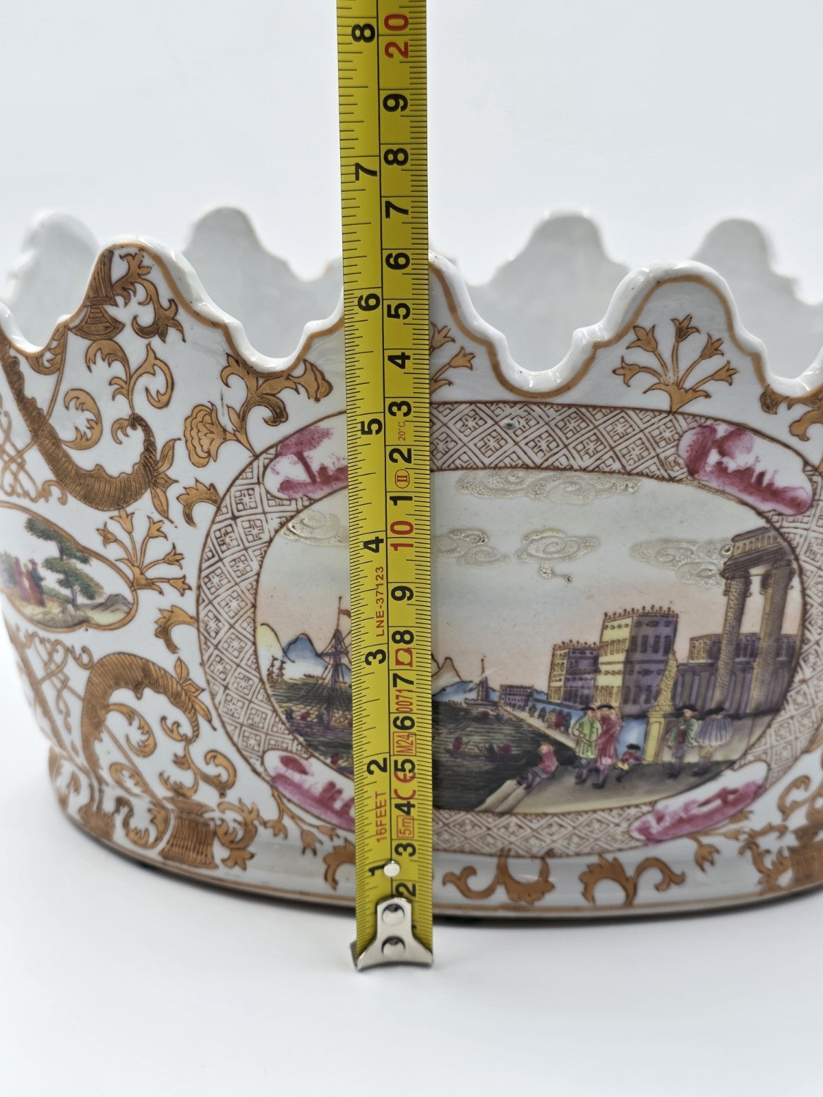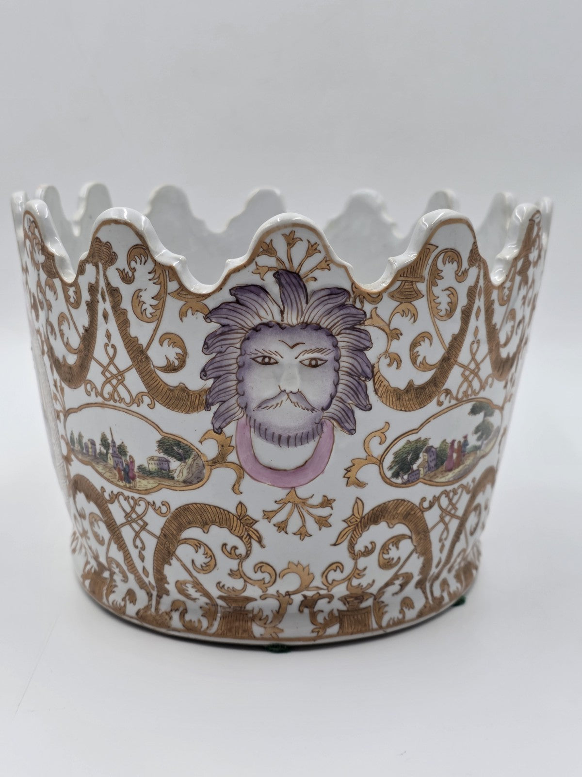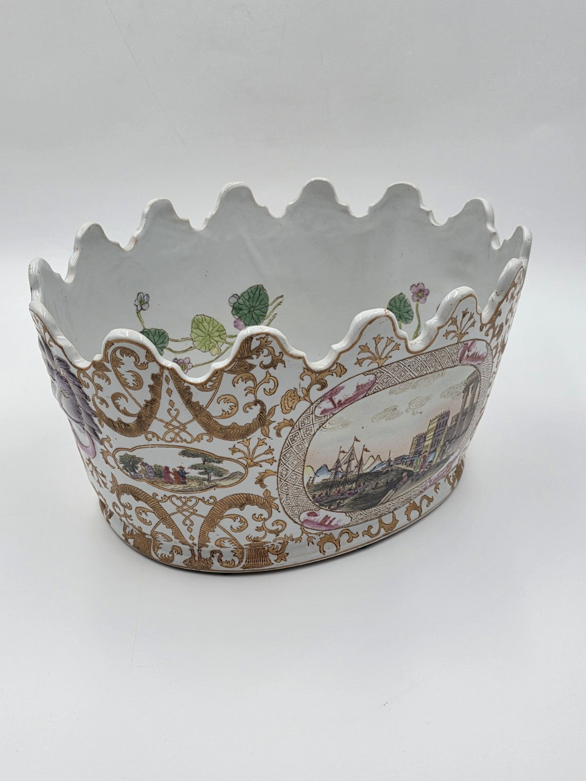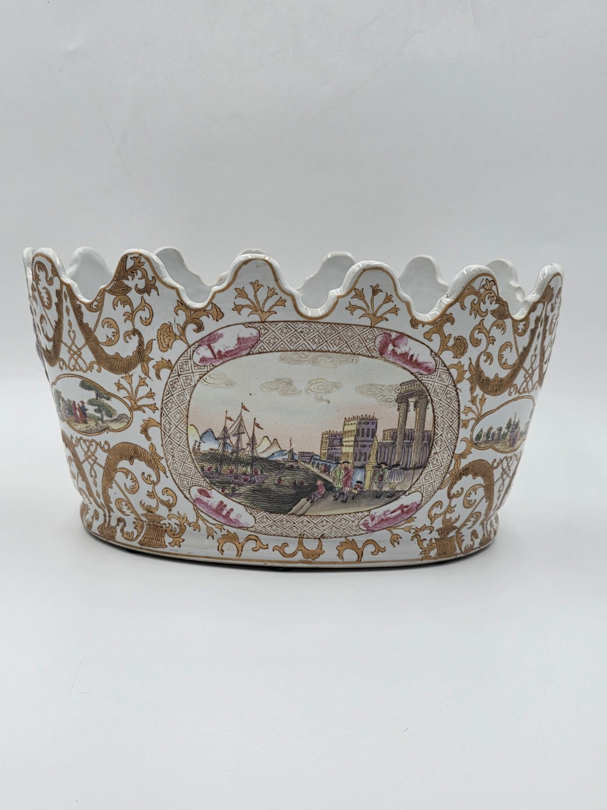 xThe Chinese Export Porcelain Jardiniere C 1920 European Harbor Scene Gilt Cachepot is a handmade piece of Chinese porcelain featuring a European harbor scene. This unique item showcases Chinese culture and craftsmanship, making it a desirable collectible for those interested in Asian cultures and ethnicities. Its intricate design and gilt detailing add to its beauty and charm, making it a standout piece for collectors of Chinese vases and jars.