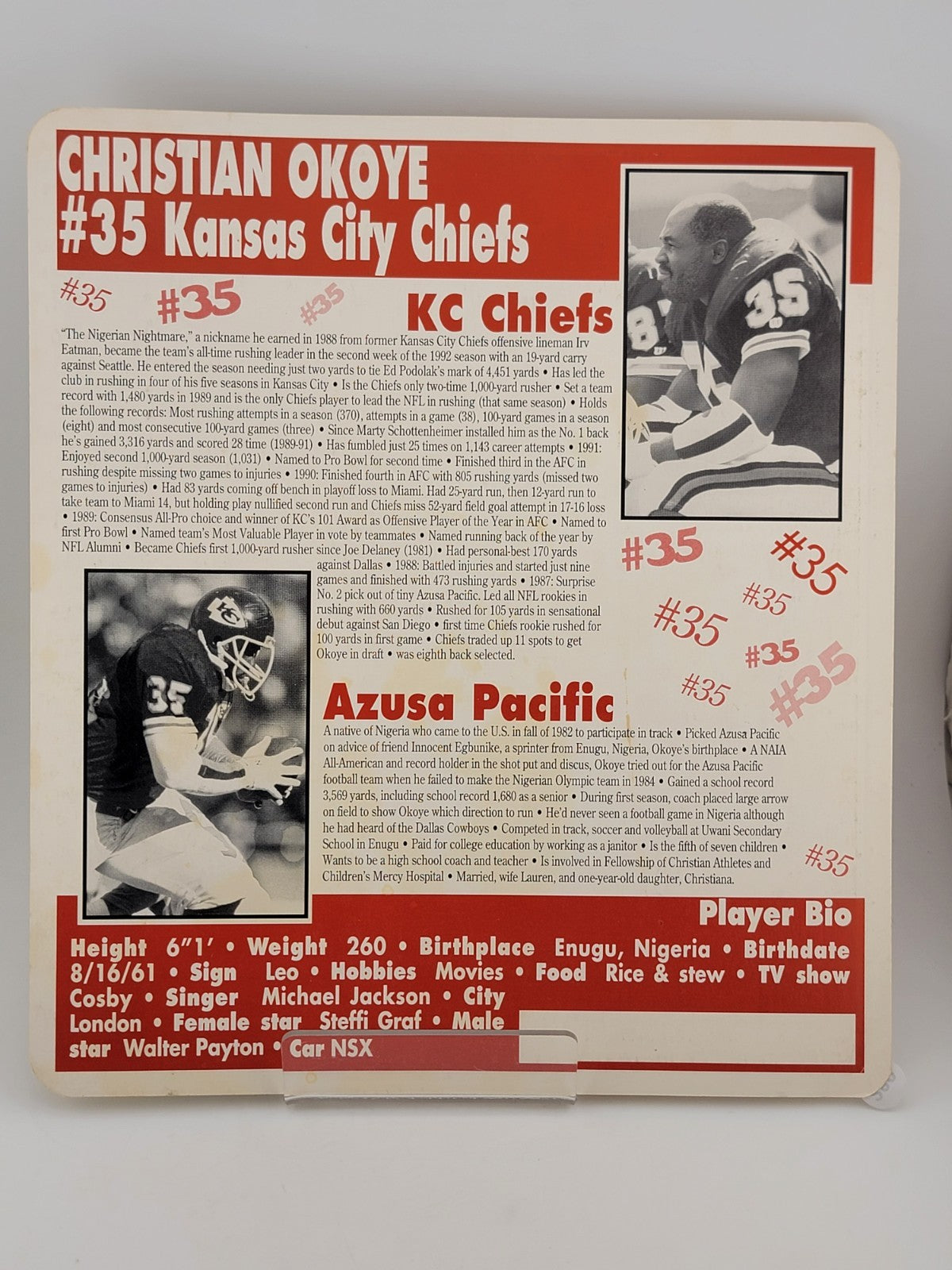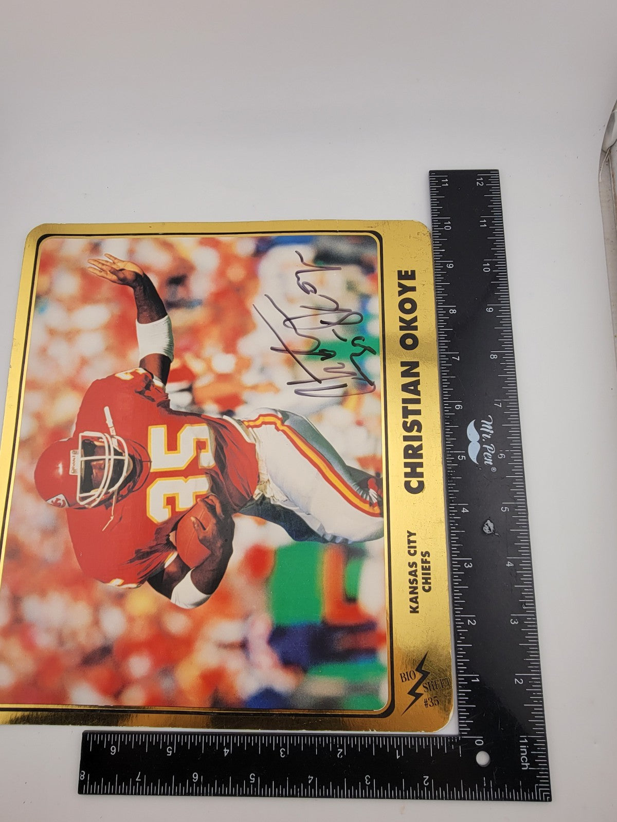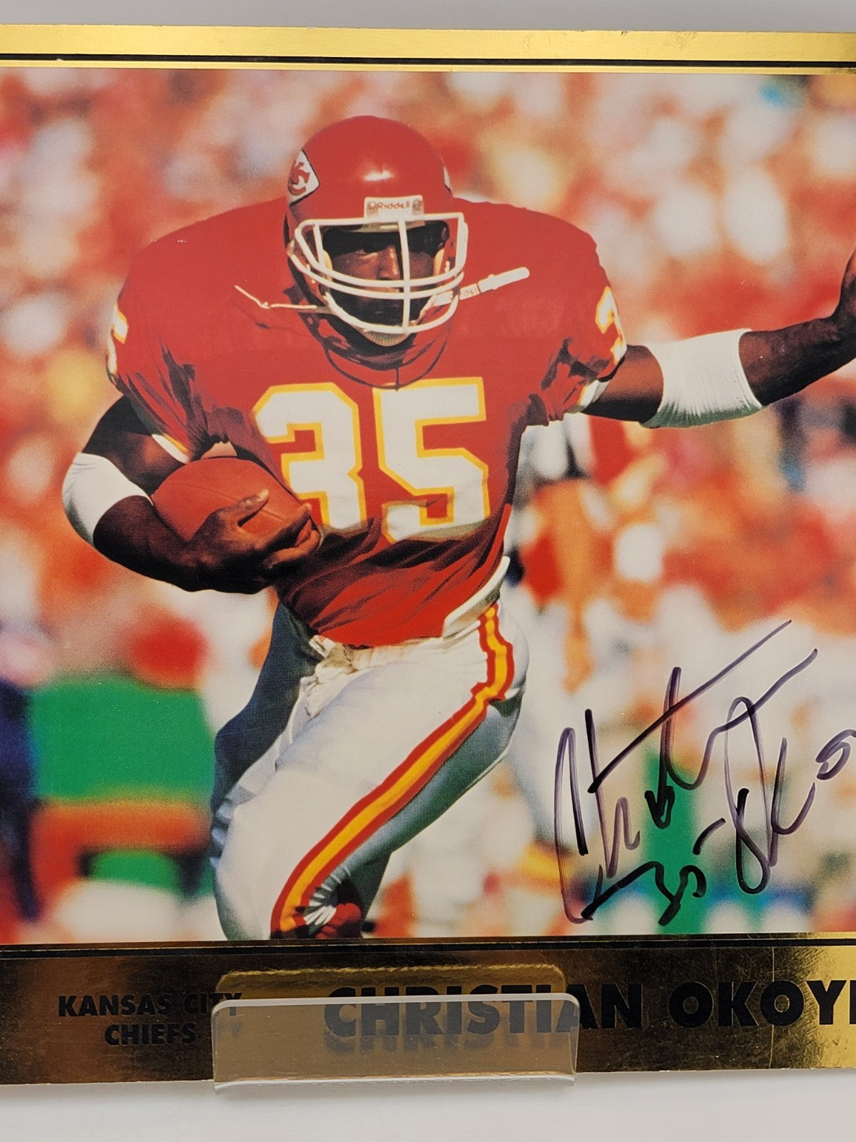 xThe product is an 8 x 10 hand-signed photo of Christian Okoye, a player for the Kansas City Chiefs in the NFL. The photo features a player bio on the back and is an original piece, not a reprint. This item is a unique and collectible piece for fans of the Kansas City Chiefs or Christian Okoye.