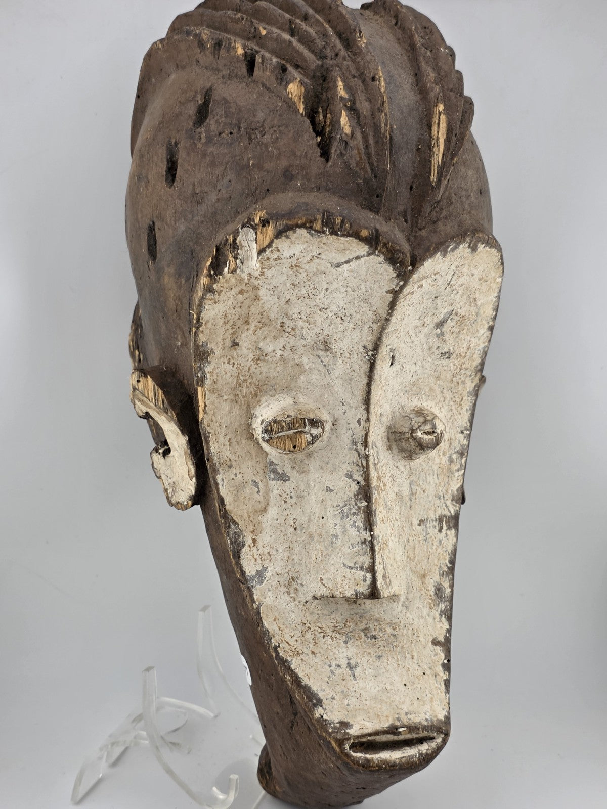 xThe Fang Ngil Mask is a hand-carved wooden artifact originating from Gabon in Central Africa. This antique piece from the early 1900s represents African tribal art and is made with the traditional kaolin clay technique. Crafted by hand, this mask embodies the rich cultural heritage and artistic traditions of the Gabonese people. A unique collectible item that offers a glimpse into the history and craftsmanship of African tribes.