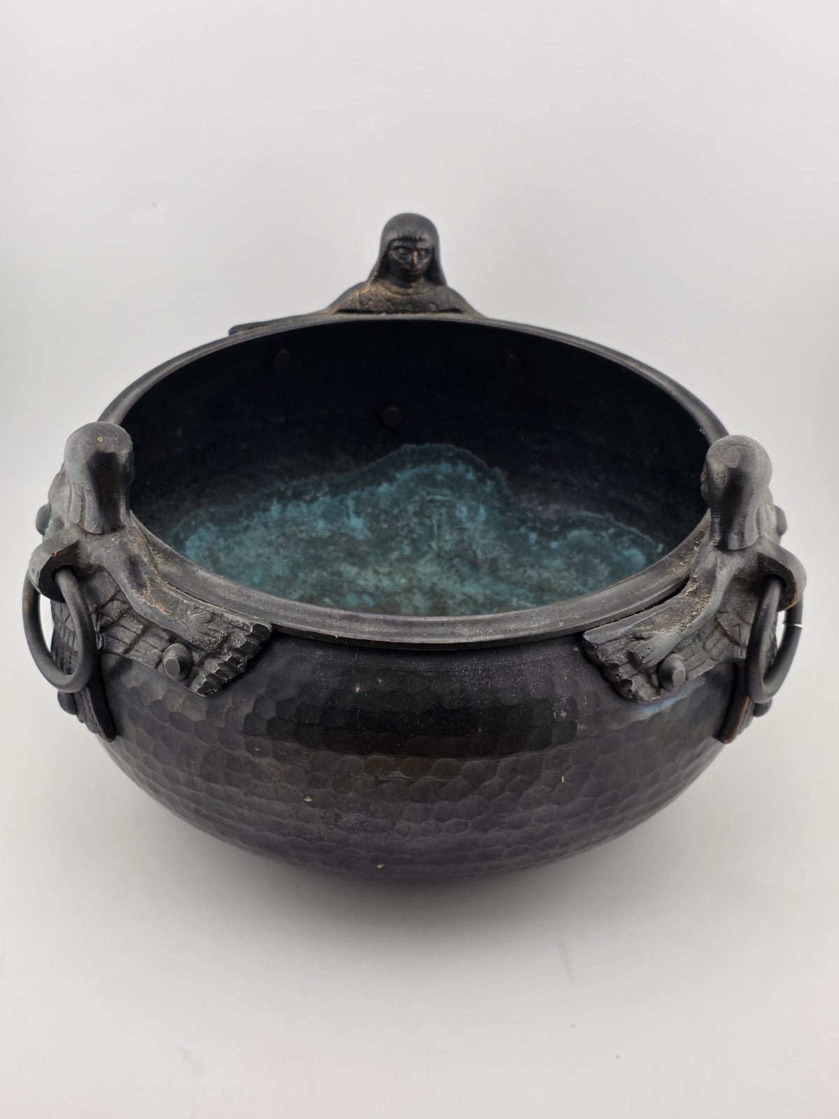 xThis product is a hand hammered copper bowl pot with a unique design featuring three brass Hittite sirens. The craftsmanship is authentic as it is handmade in Türkiye. The materials used are high quality copper, adding to its durability and value. This collectible item is a true representation of ancient Hittite artistry and craftsmanship, making it a desirable piece for collectors or enthusiasts of metalware and cultural artifacts.