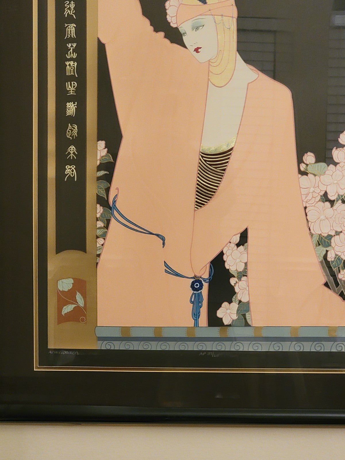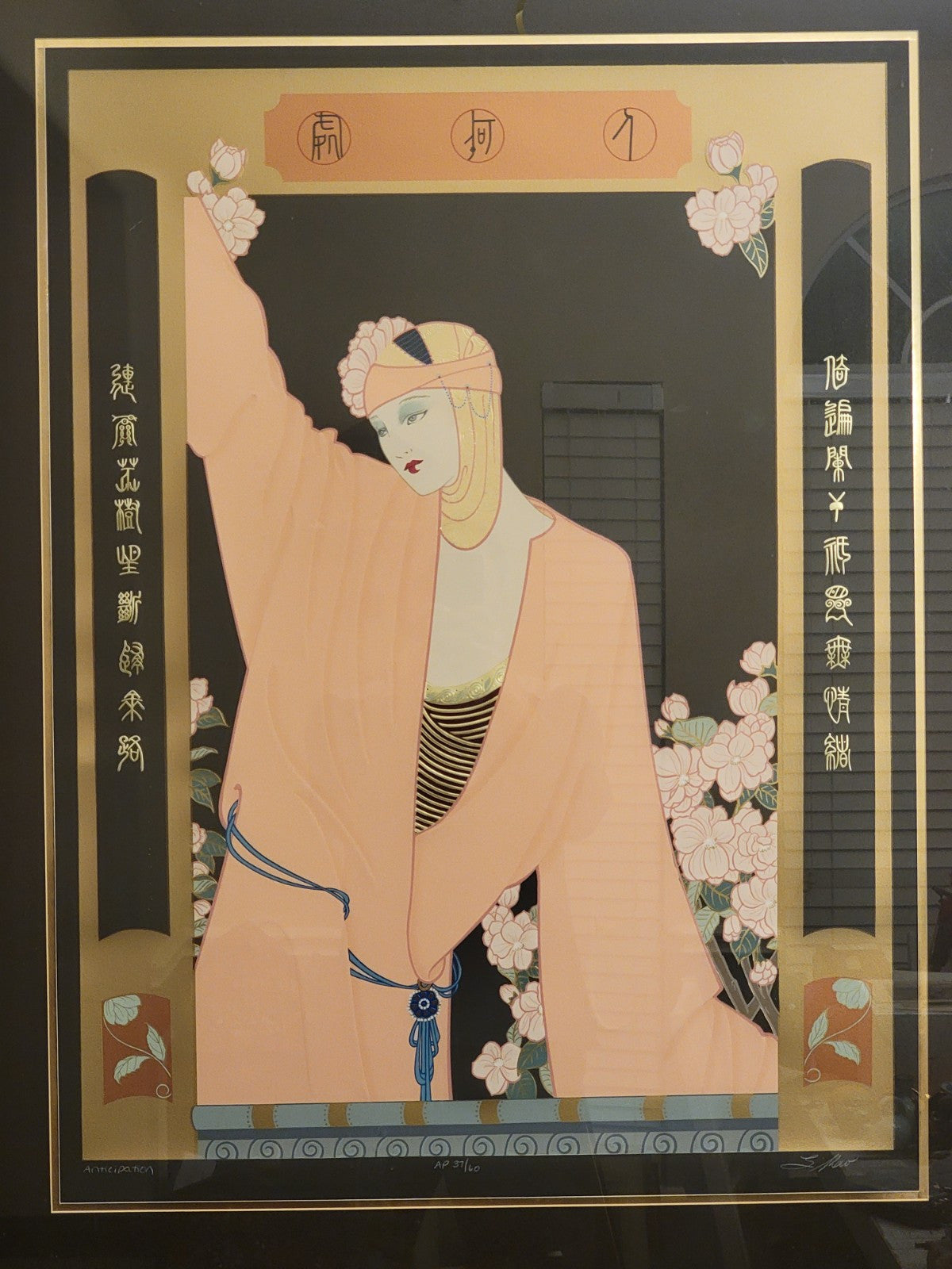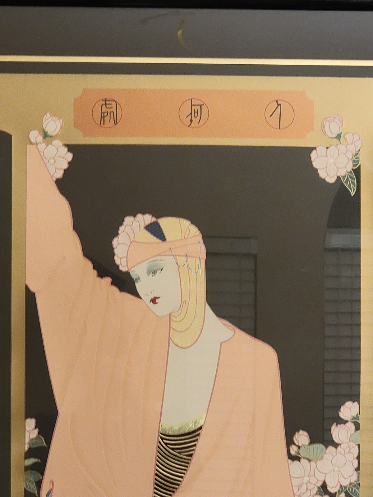 xThe artwork titled "Anticipation" by Lillian Shao is a large serigraph on black paper, measuring 41 inches in width and 48 inches in height. It features an Art Deco and Asian style depicting women in a Chinese setting. The piece is framed and signed by the artist, numbered 37/60, and is a limited edition licensed reprint from 1990. The vibrant multi-color print showcases intricate details and is a collector's item for art and fashion enthusiasts.