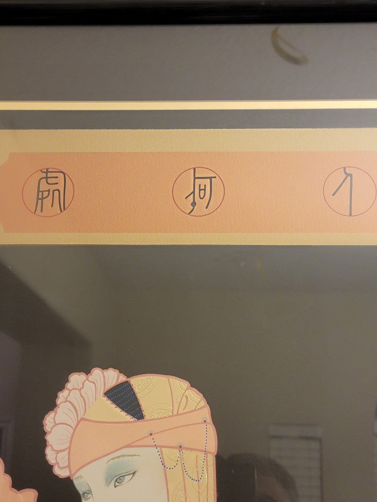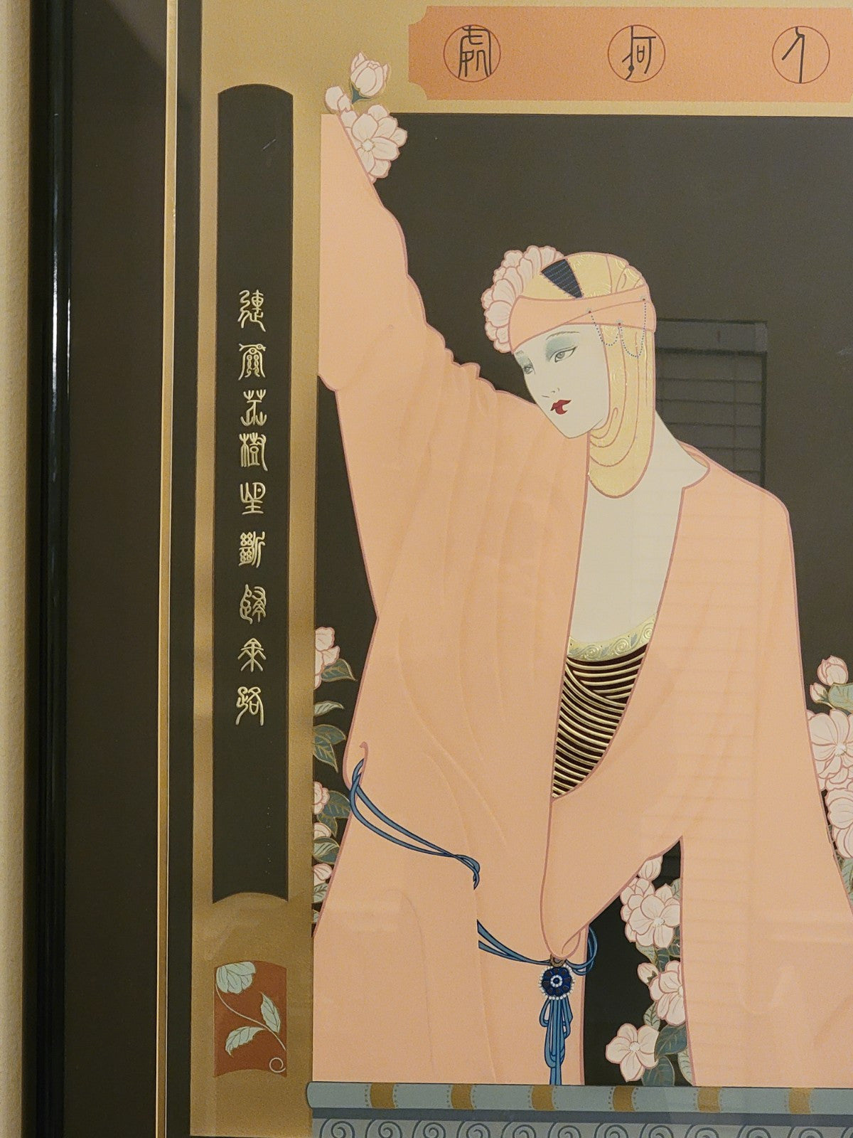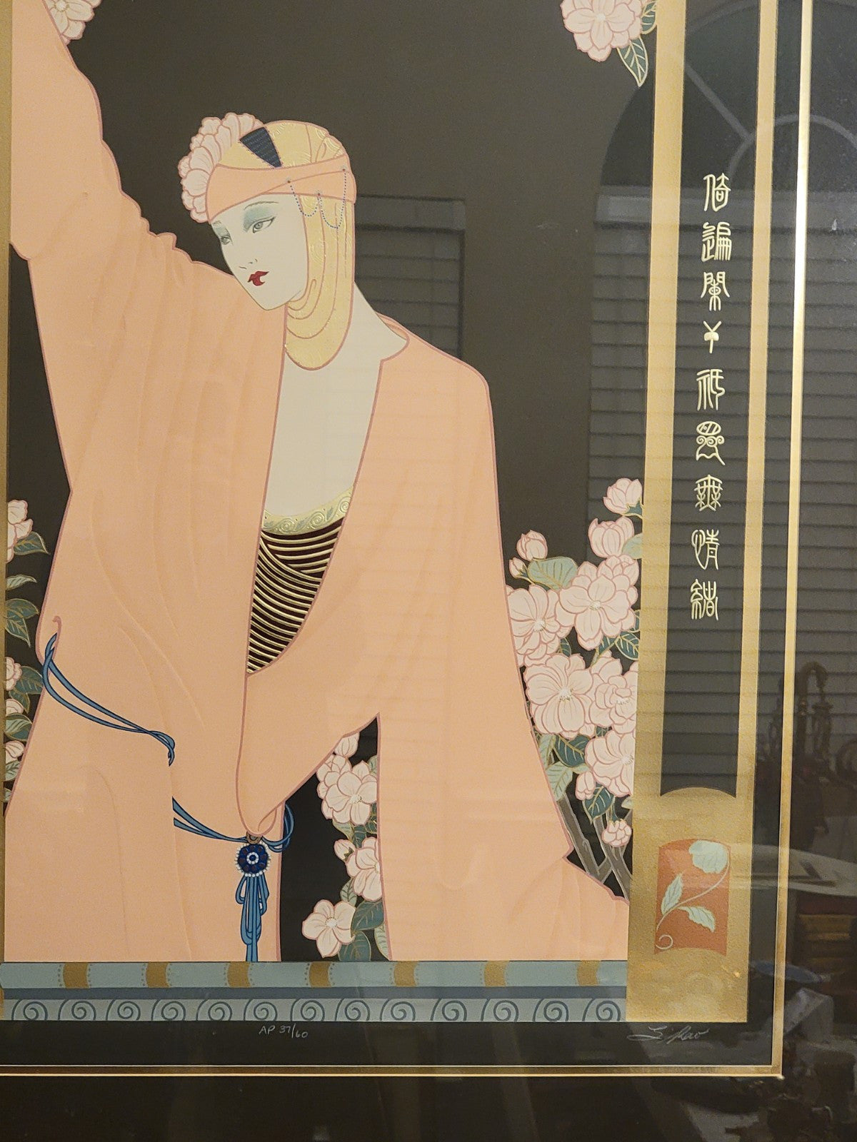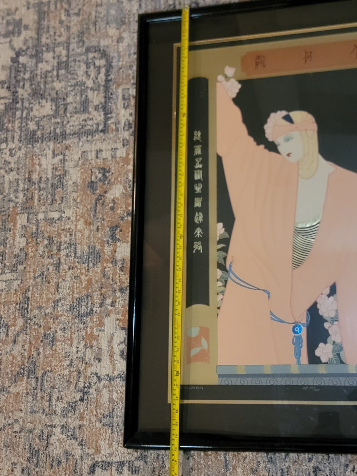 xThe artwork titled "Anticipation" by Lillian Shao is a large serigraph on black paper, measuring 41 inches in width and 48 inches in height. It features an Art Deco and Asian style depicting women in a Chinese setting. The piece is framed and signed by the artist, numbered 37/60, and is a limited edition licensed reprint from 1990. The vibrant multi-color print showcases intricate details and is a collector's item for art and fashion enthusiasts.