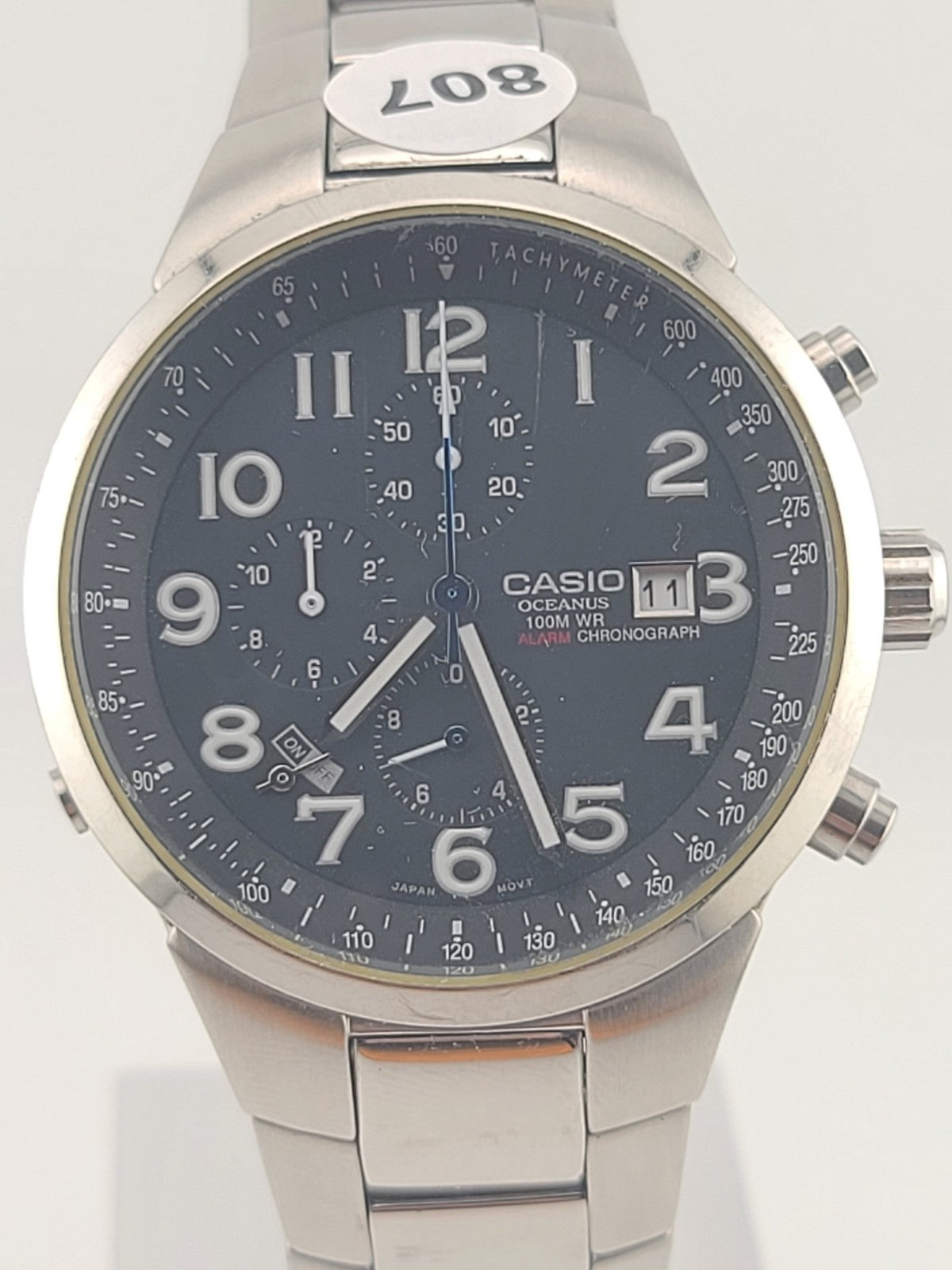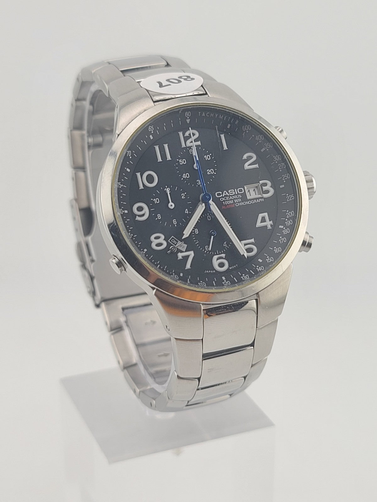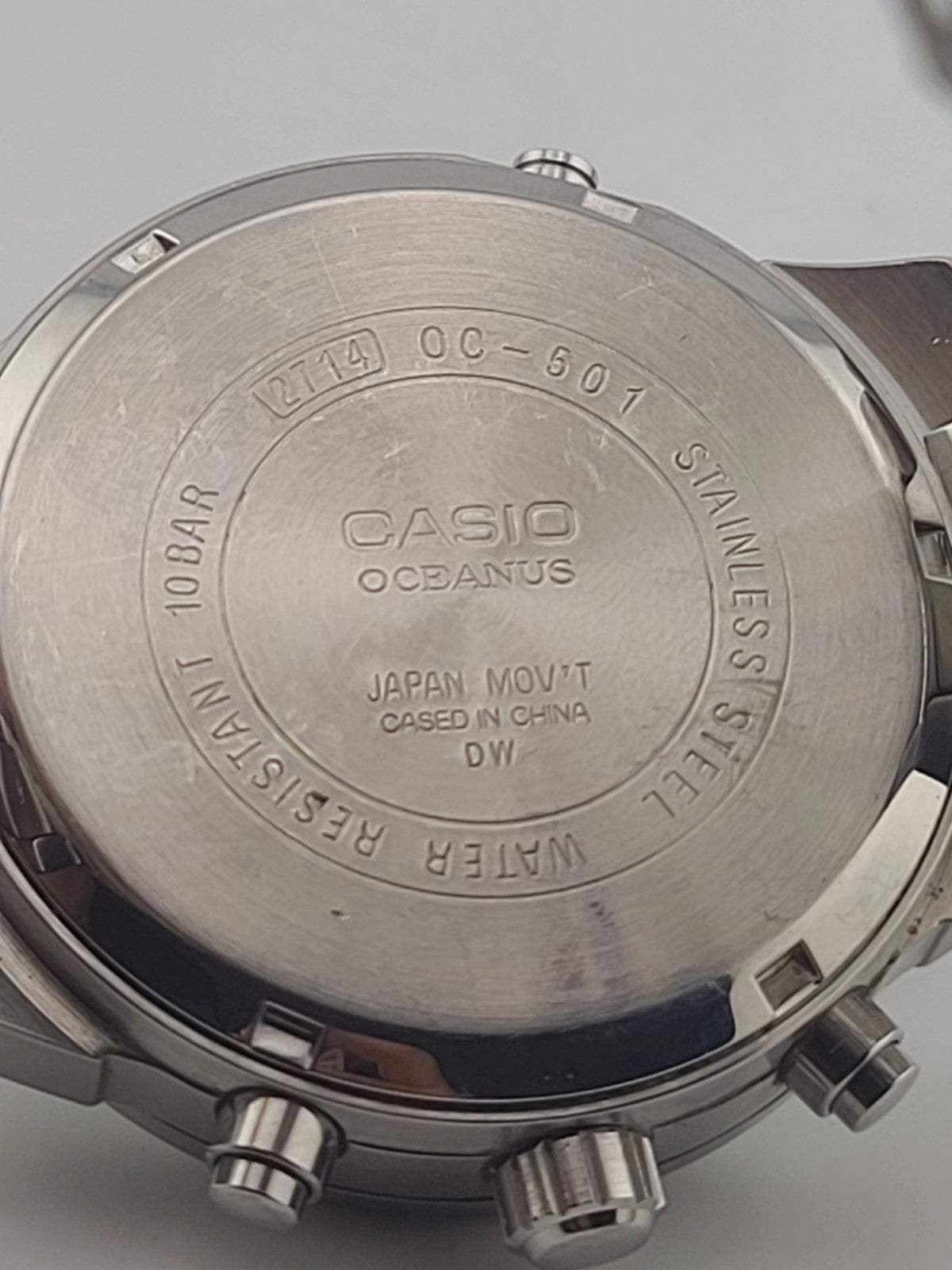 xThe Men's Casio Oceanus OC 501 Chronograph Analog Watch 2714 MOV 100M is a stylish timepiece designed for everyday wear. With a sleek silver stainless steel case and band, this watch exudes a classic and casual elegance. Featuring a quartz movement and water resistance up to 100m, it is both reliable and durable. The black dial with Arabic numerals adds a touch of sophistication, making it a versatile accessory for any outfit. Perfect for men who appreciate quality and timeless design in their wristwatches.