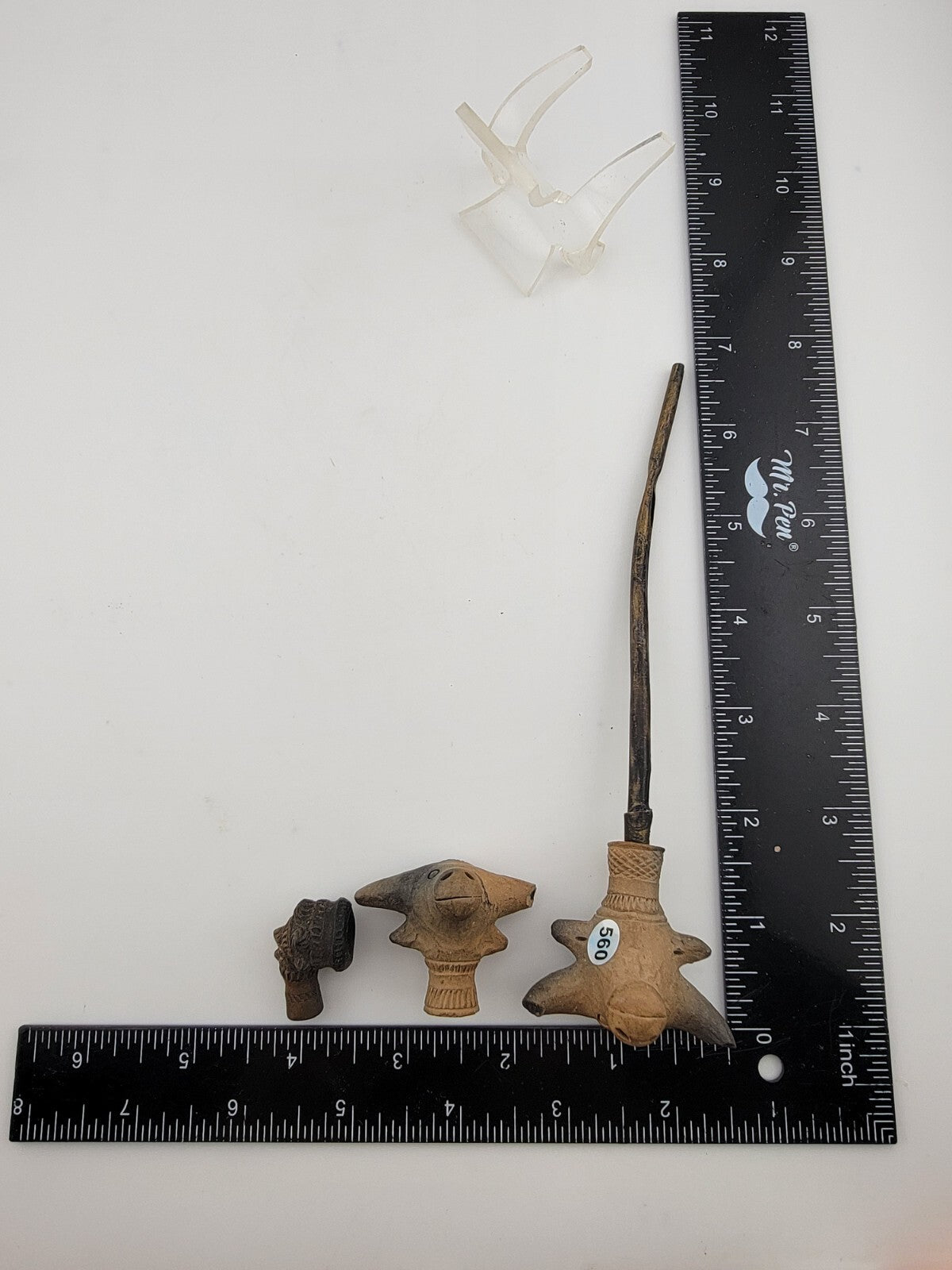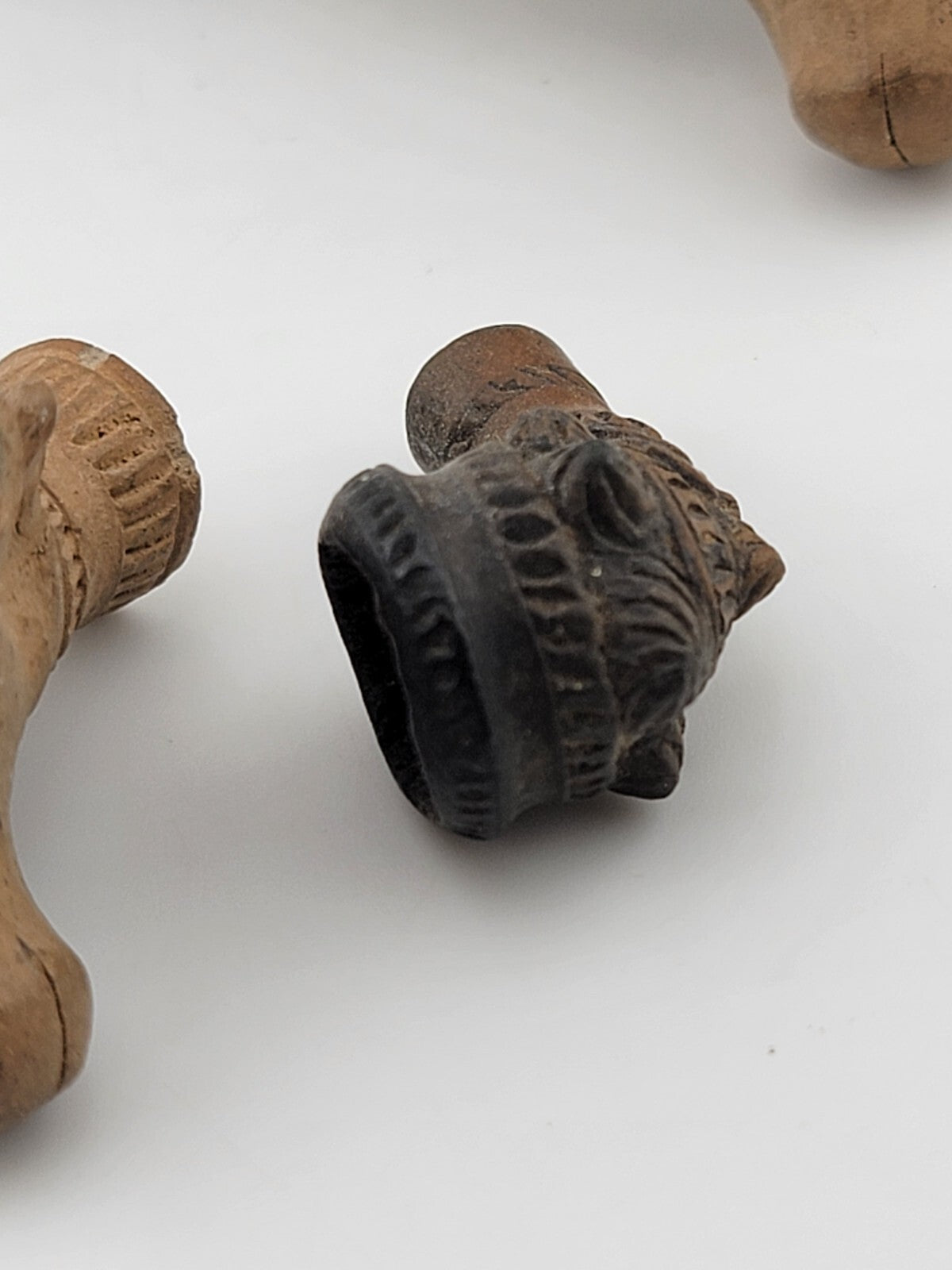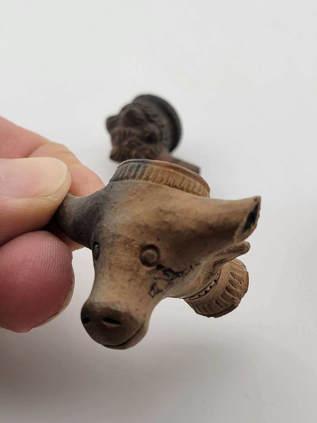 xThis is a rare antique 19th-century terracotta clay pipe featuring a unique bull head design. The set includes two additional pipes, making it a valuable collectible for pipe enthusiasts. The pipe is brown in color, adding to its vintage appeal and historical significance. Its intricate design and craftsmanship reflect the artistry of the era, making it a sought-after item for collectors of tobacco memorabilia.