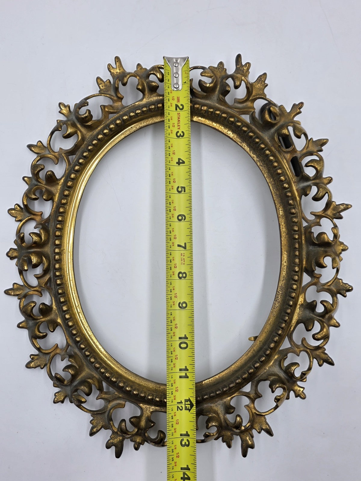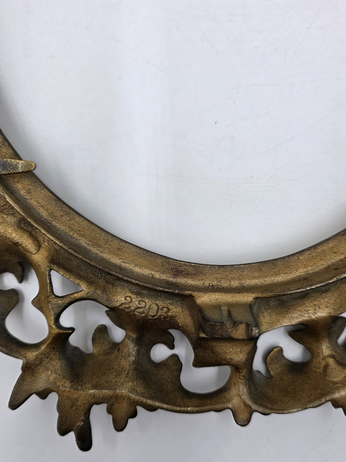 xThis product is a rare antique Baroque Victorian ornate gilt brass oval frame vanity mirror. It features a floral pattern in a gold color, with a Victorian style and romantic theme. The frame is made of brass and has a gilted finish, adding an elegant touch to any tabletop stand setting. Measuring 11 x 14 inches, this original piece is perfect for displaying a single photo or serving as a decorative collectible for those who appreciate antique and vintage decor.