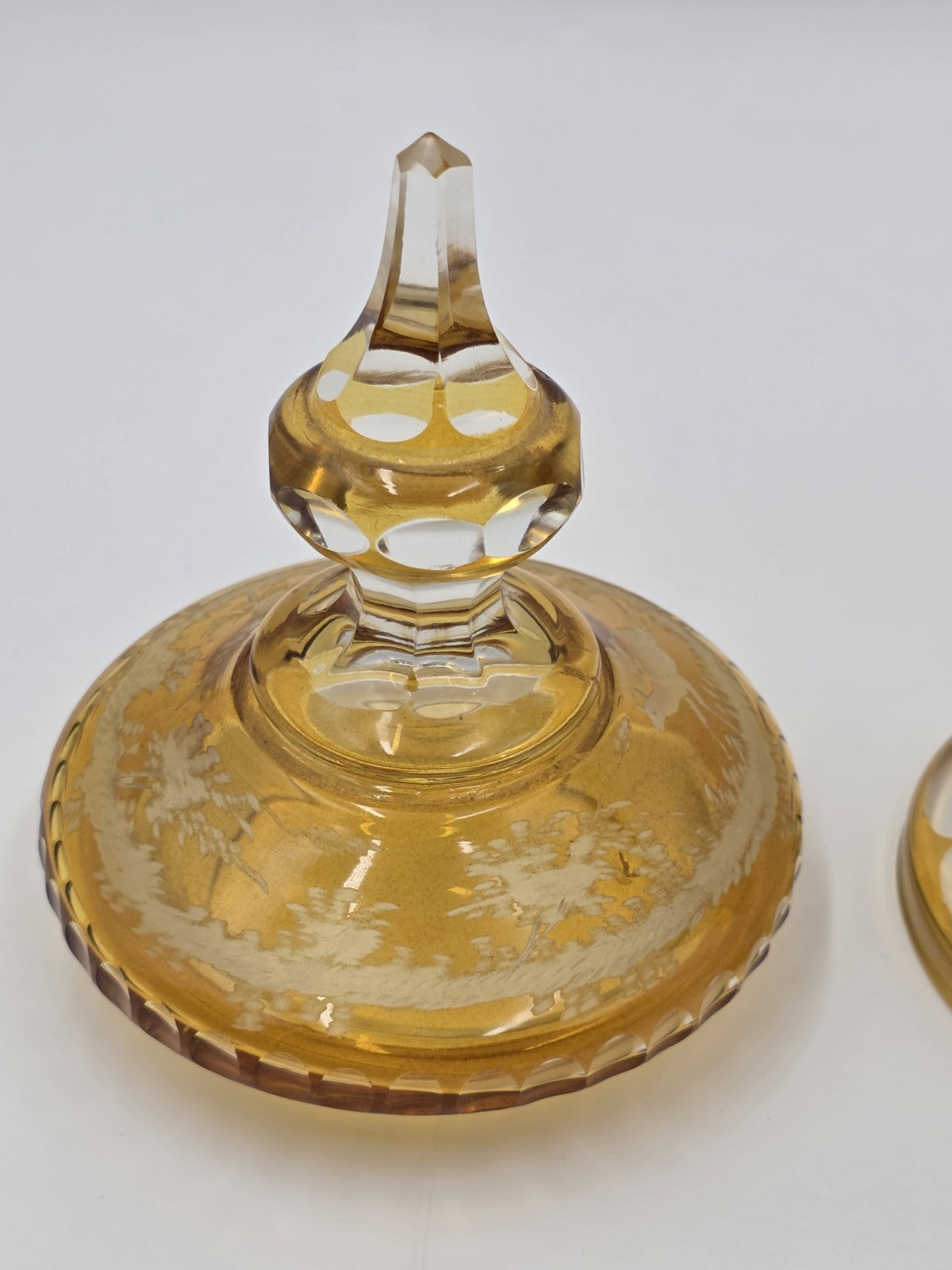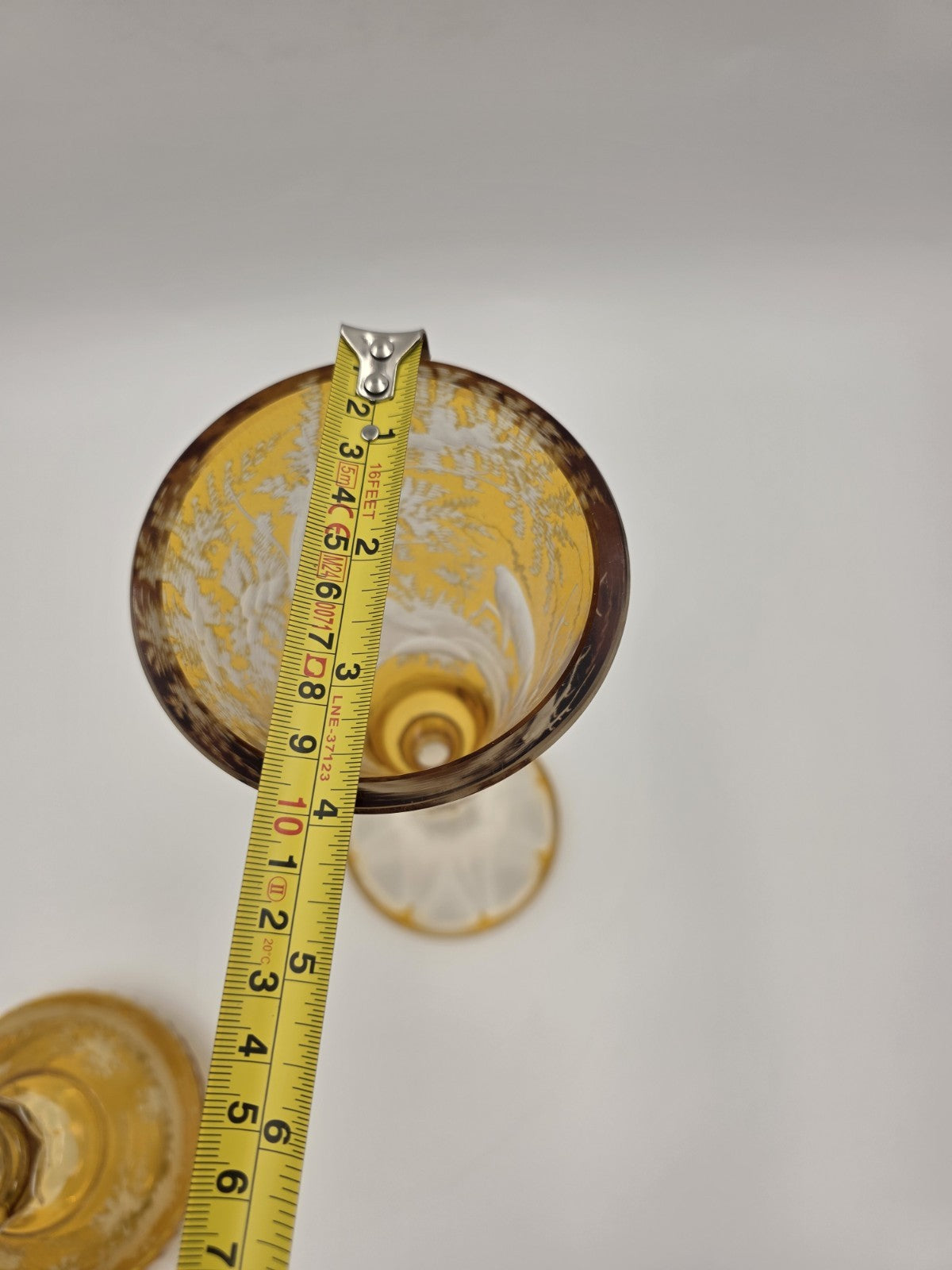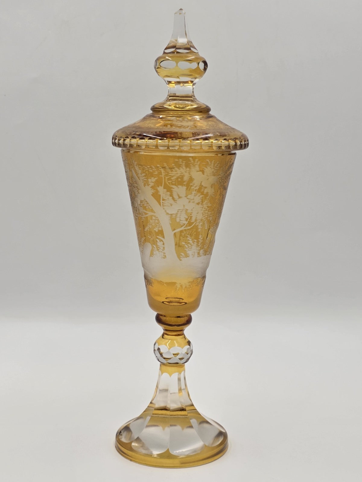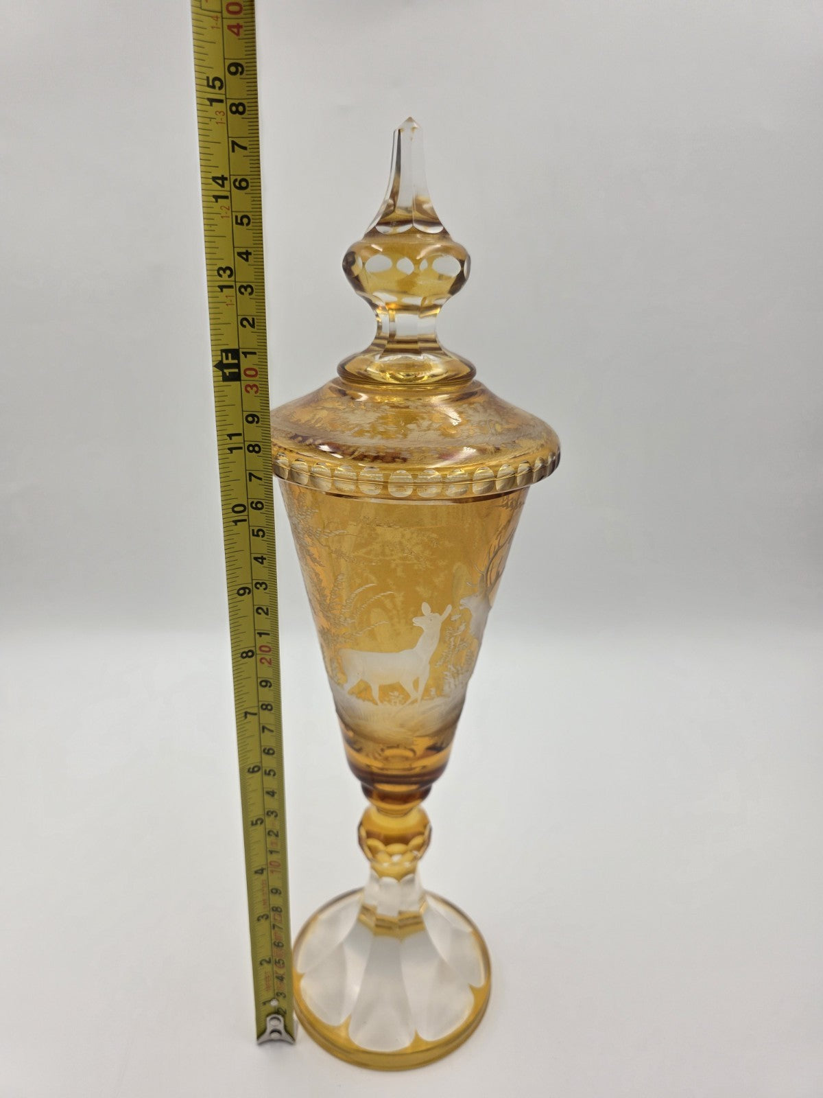 xThis rare antique C1920's Bohemian Amber Cut to Clear Lidded Goblet features a beautiful forest scene with a stag, reflecting European style and craftsmanship. Made of glass and crystal in the Czech Republic, this vase showcases abstract art with a unique Bohemian design. The amber color adds a touch of elegance to any space, making it a stunning decorative piece for collectors of vintage and unique glassware.