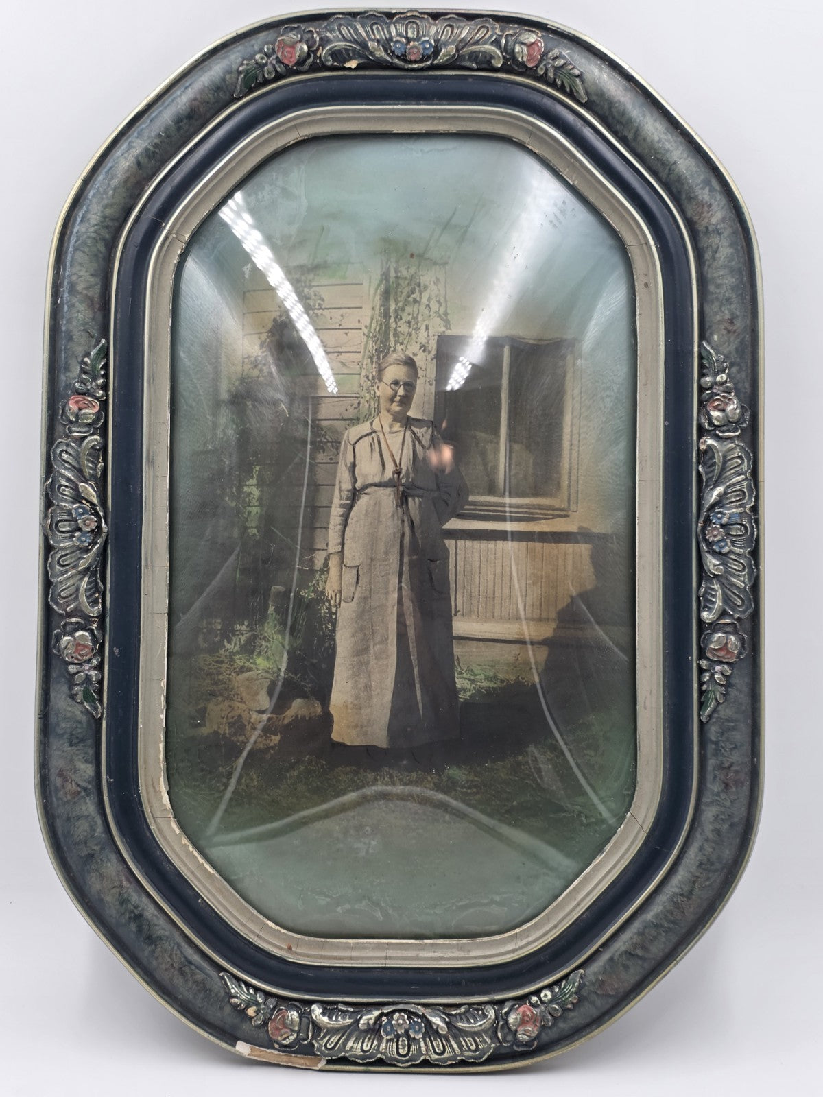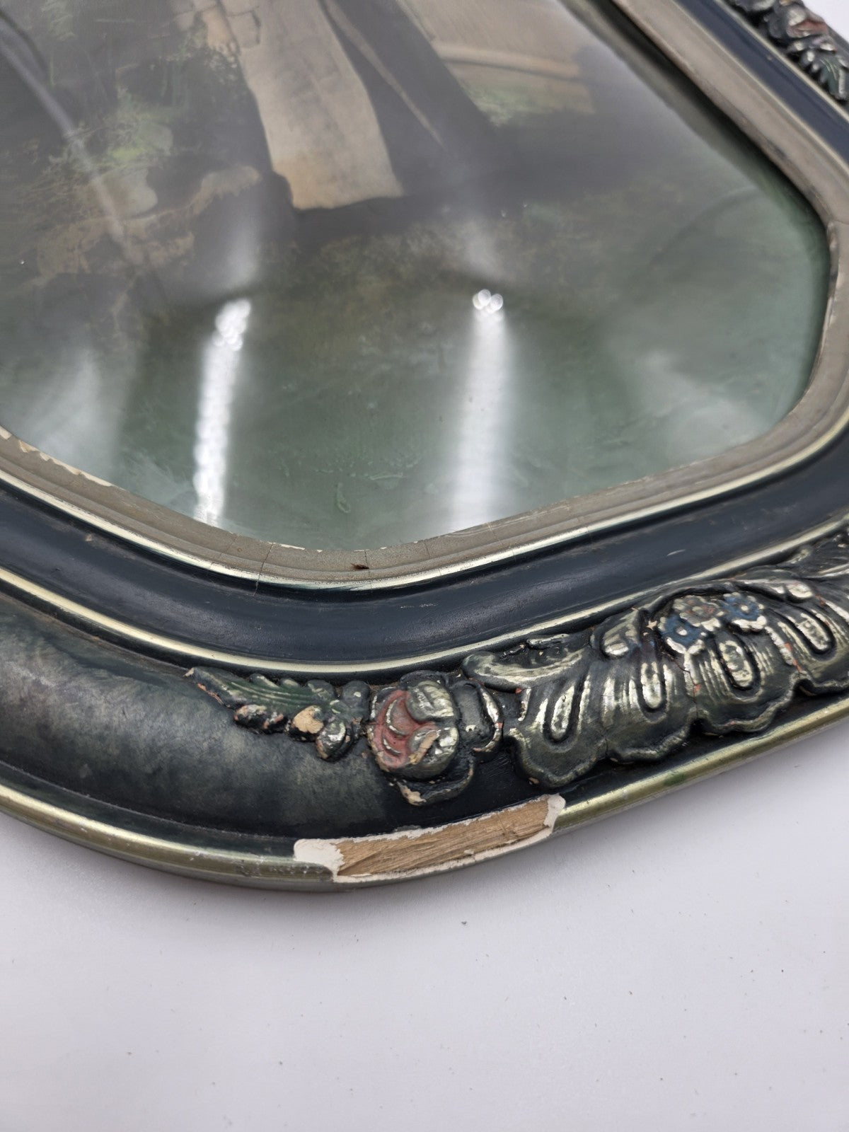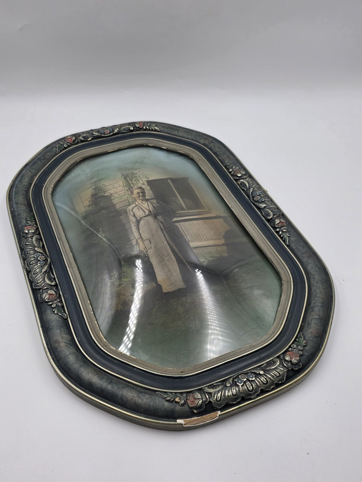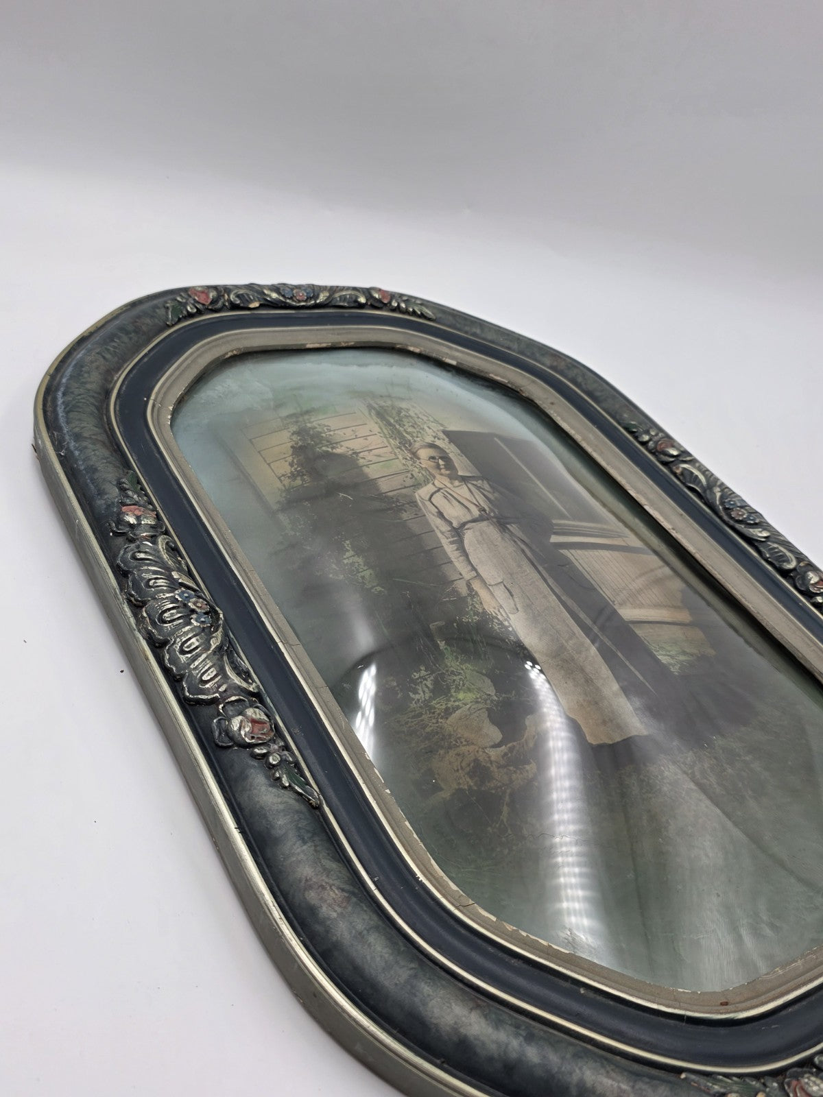 xThis rare antique Victorian convex bubble glass lady portrait in a gilt oval frame is a unique and elegant decorative collectible. The portrait, framed in a gold gilt oval frame, adds a touch of vintage charm to any occasion. Measuring 21 inches in height and 14 inches in width, this Victorian style frame is perfect for displaying a photo or picture in a portrait orientation. Made of bubble glass, this one-of-a-kind piece showcases intricate details and a timeless aesthetic that is sure to be a conversation starter in any home decor setting.