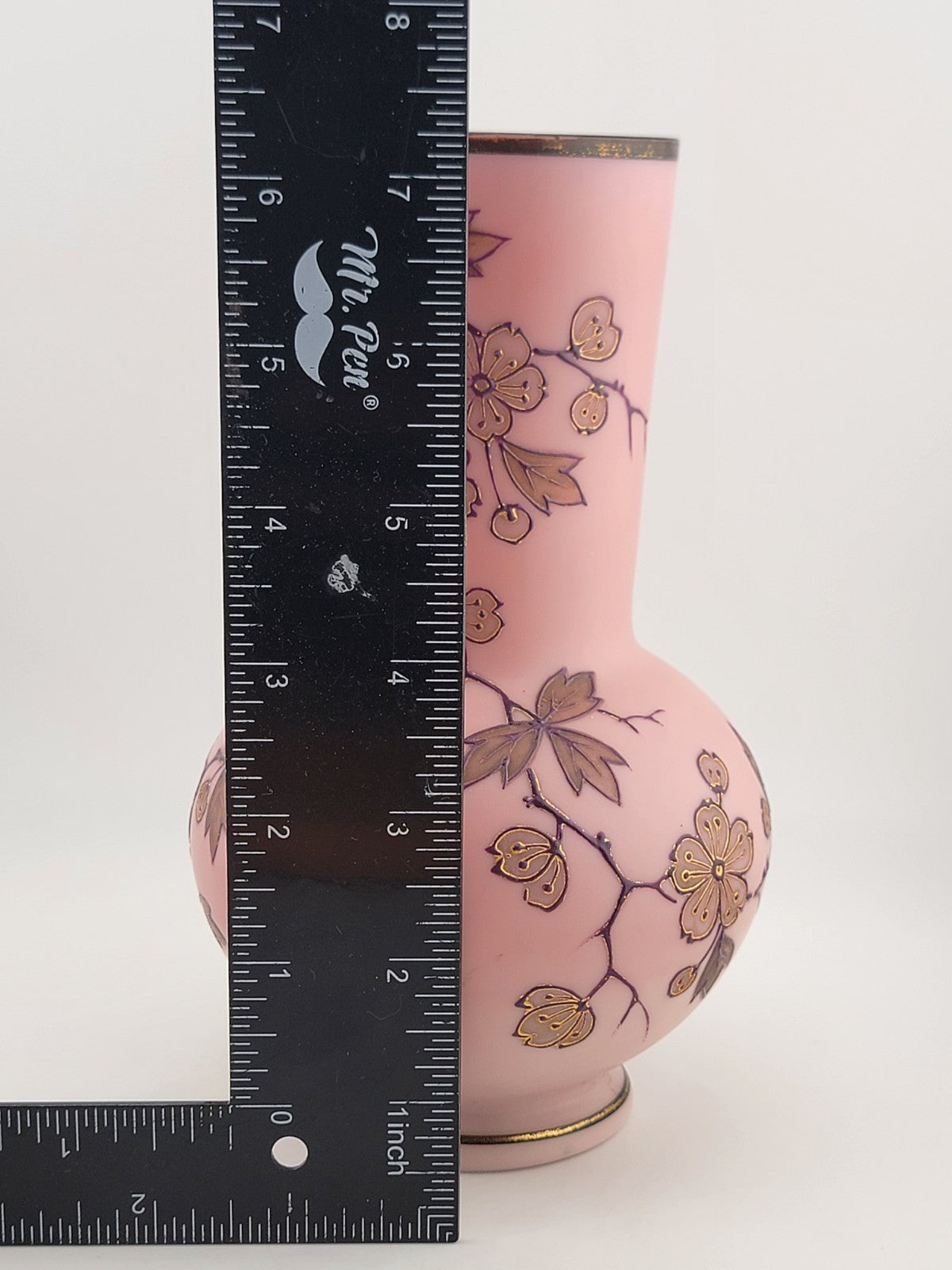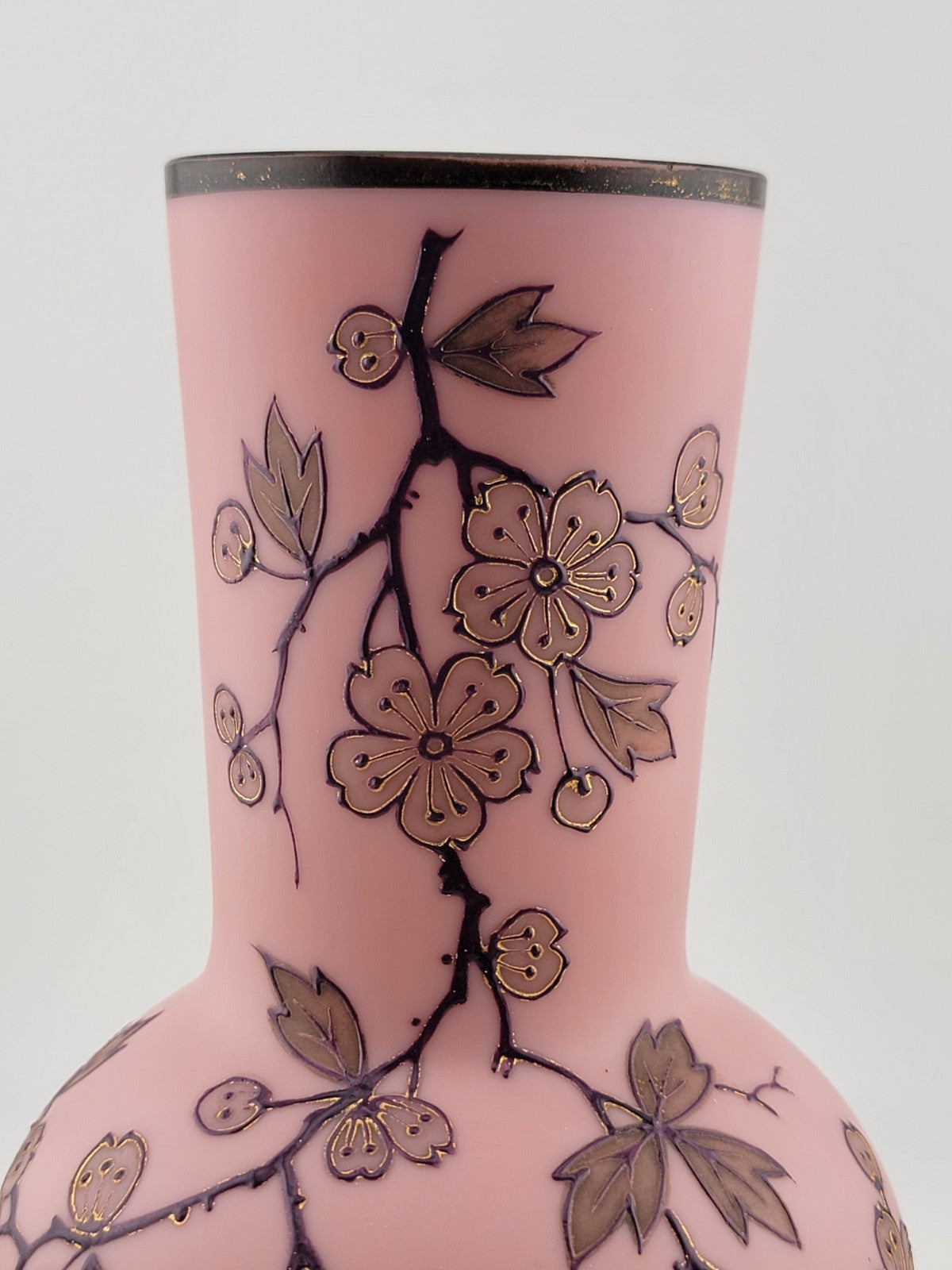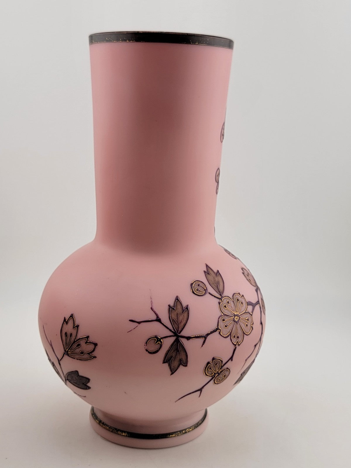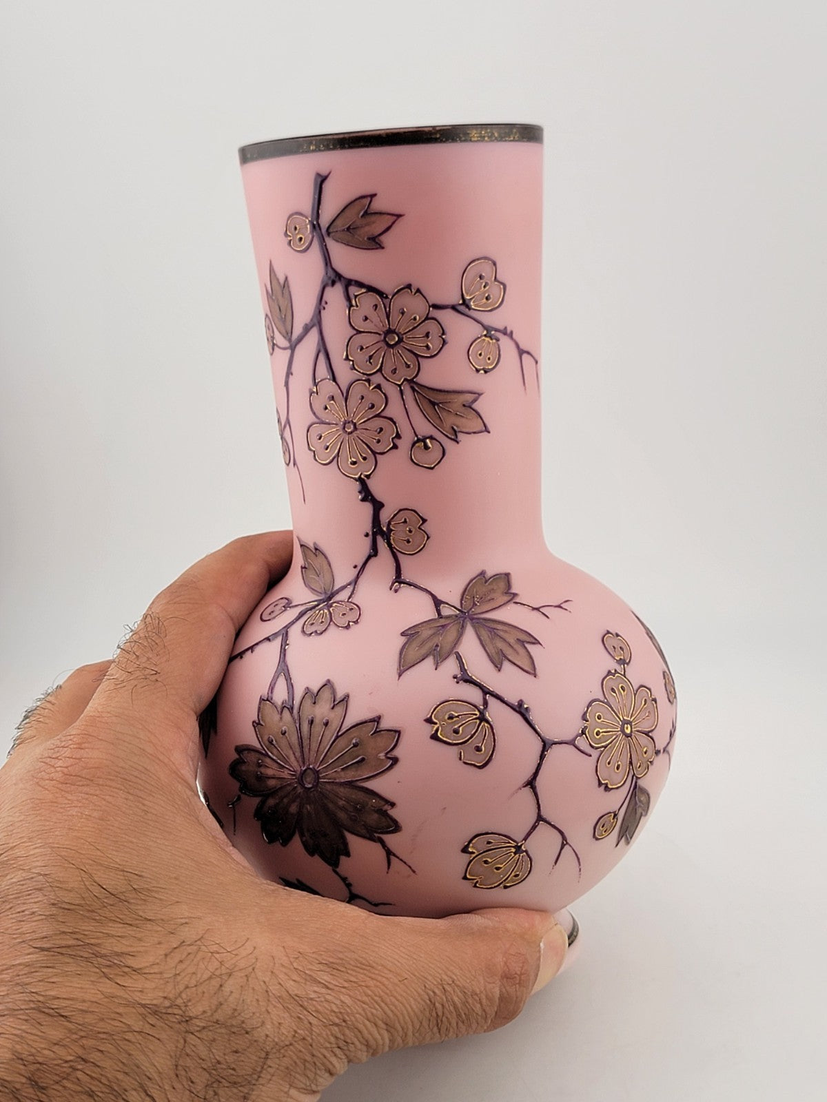 xThe PK Poschinger Krystallie Antique Burmese glass Pink vase is a rare collectible piece that exudes elegance and charm. With its all-over floral pattern and delicate pink color, this vase is a stunning addition to any home decor. Handcrafted with care and attention to detail, this art glass vase showcases the beauty of a rose in a unique production style. Made from high-quality glass, this vase is not only a functional piece but also a valuable antique item for collectors who appreciate fine craftsmanship and timeless design.