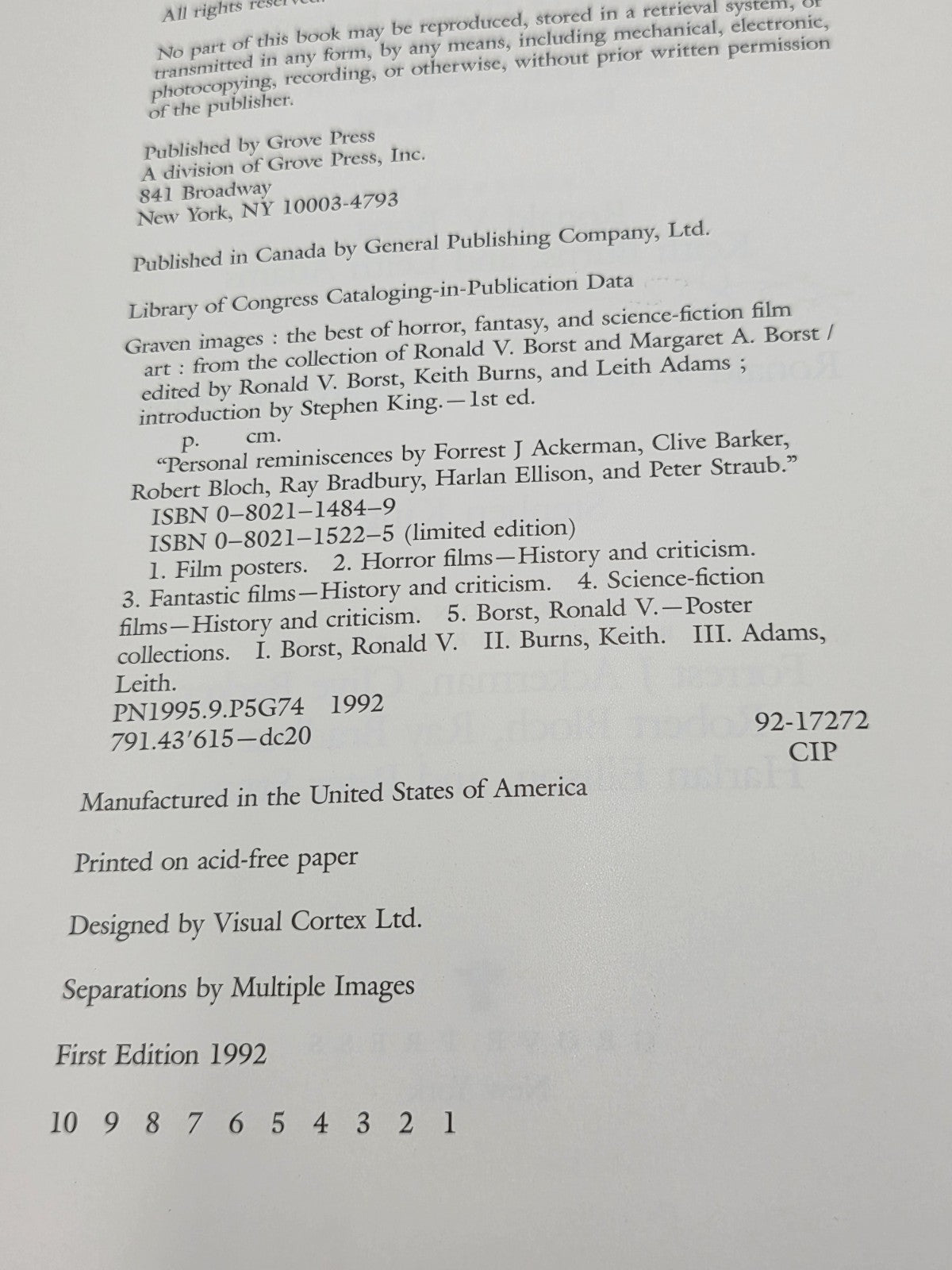 xThe product is a rare first edition hardcover book titled "Images" by authors Art and Keith Burns. It is a horror film art book signed by both the authors and featuring inscriptions. The book is intended for young adults and adults, with a narrative type of fiction focusing on horror and film topics. Published in 1992 in the United States, this picture book is a unique addition to any horror fan's collection.