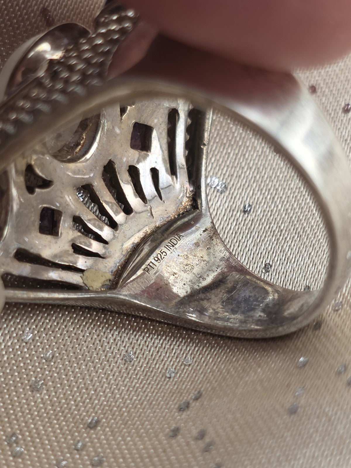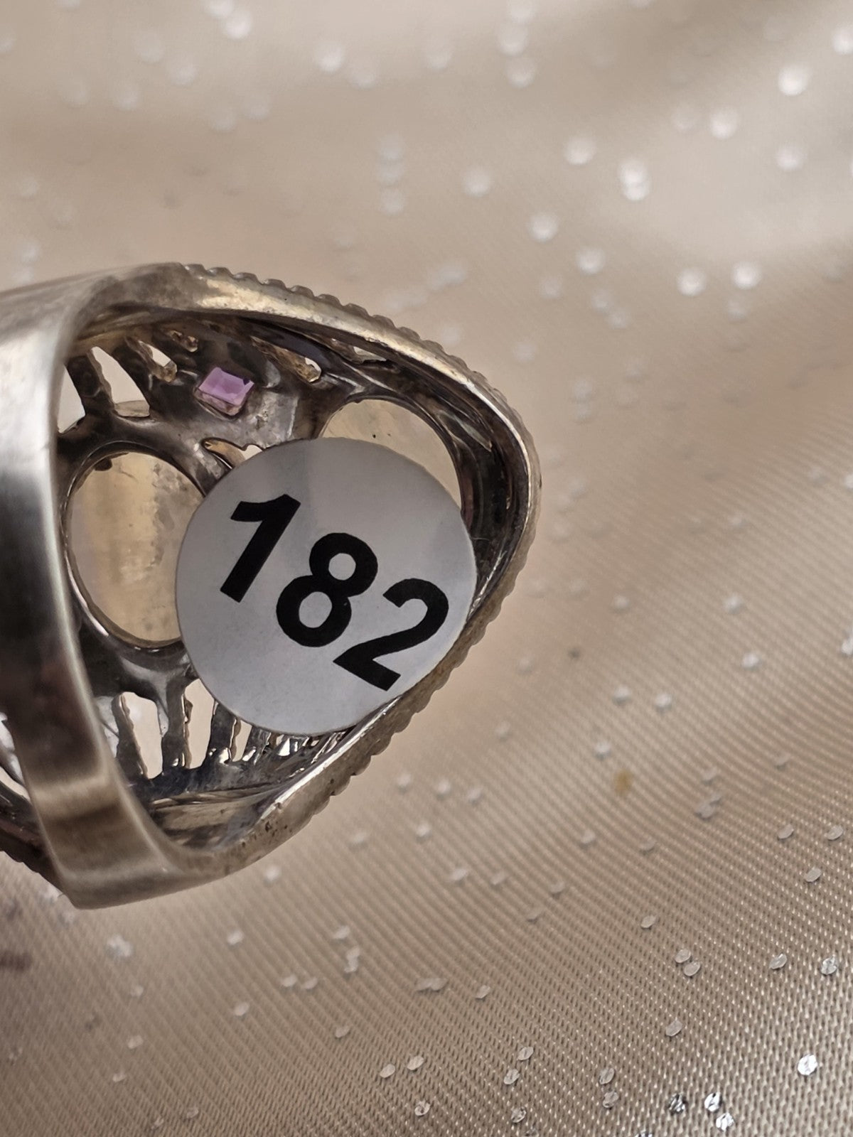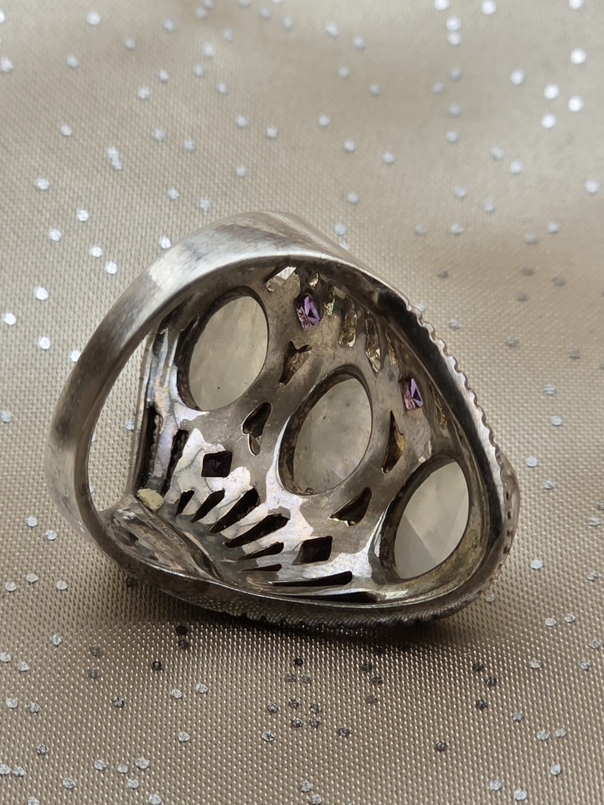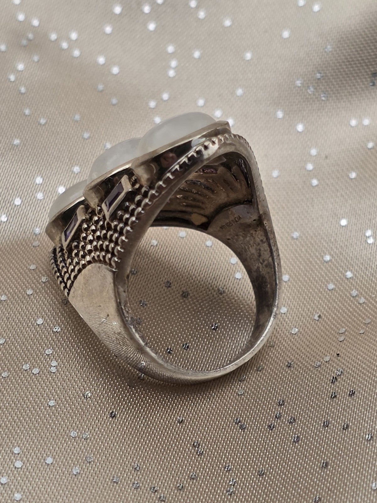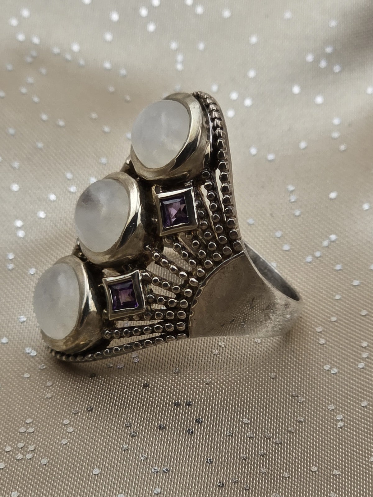 xThe Rare Himalayan Gems 3-Moonstone & Amethyst Multistone Sterling Silver Ring is a stunning piece of fine jewelry featuring a beautiful combination of white moonstone and purple amethyst stones set in 925 sterling silver. This unique ring has an oval-shaped main stone with a total of 7 gemstones, making it a luxurious and eye-catching accessory for any outfit. The brand's rarity adds to the exclusivity of this piece, making it a valuable addition to any jewelry collection.