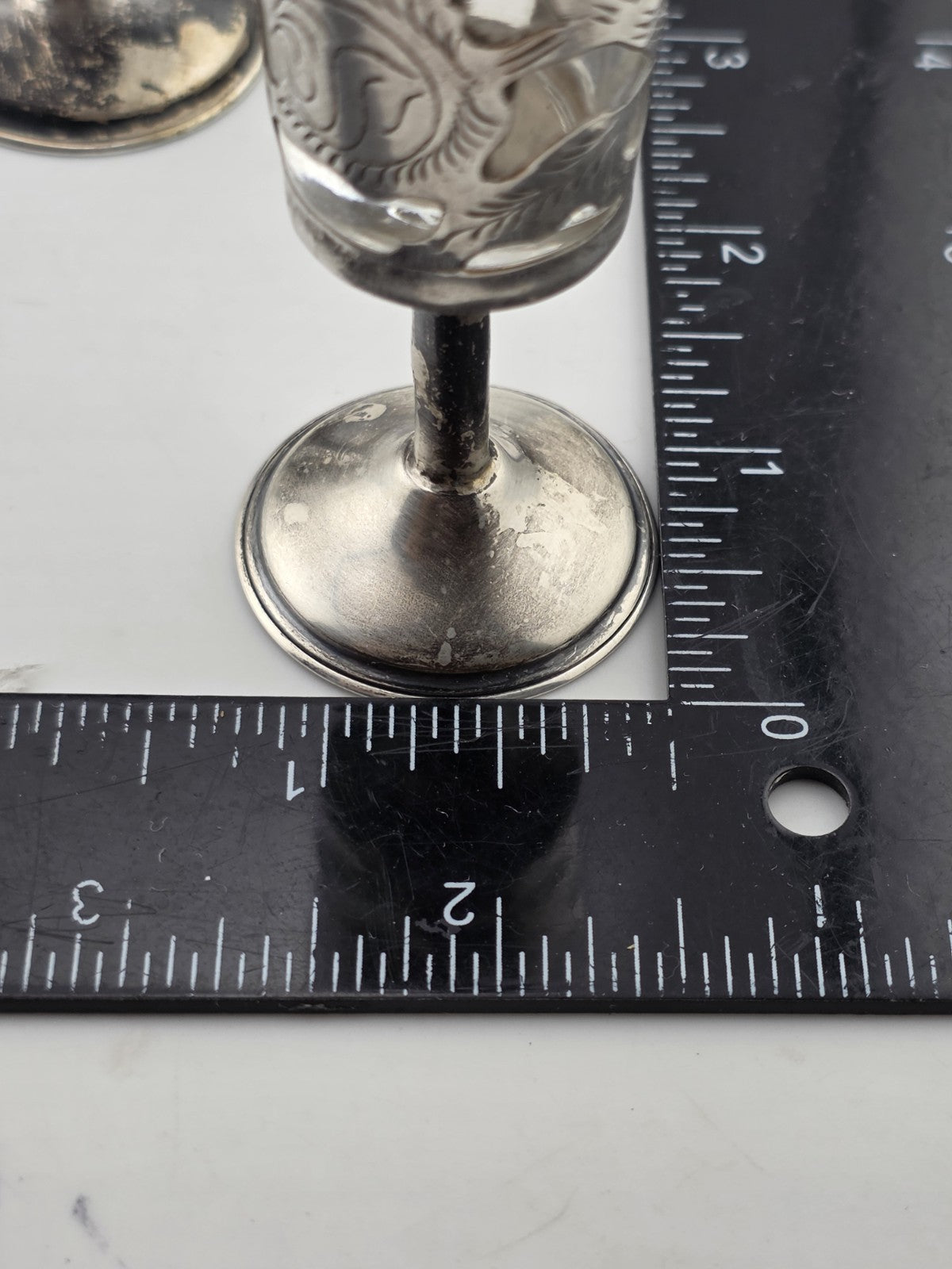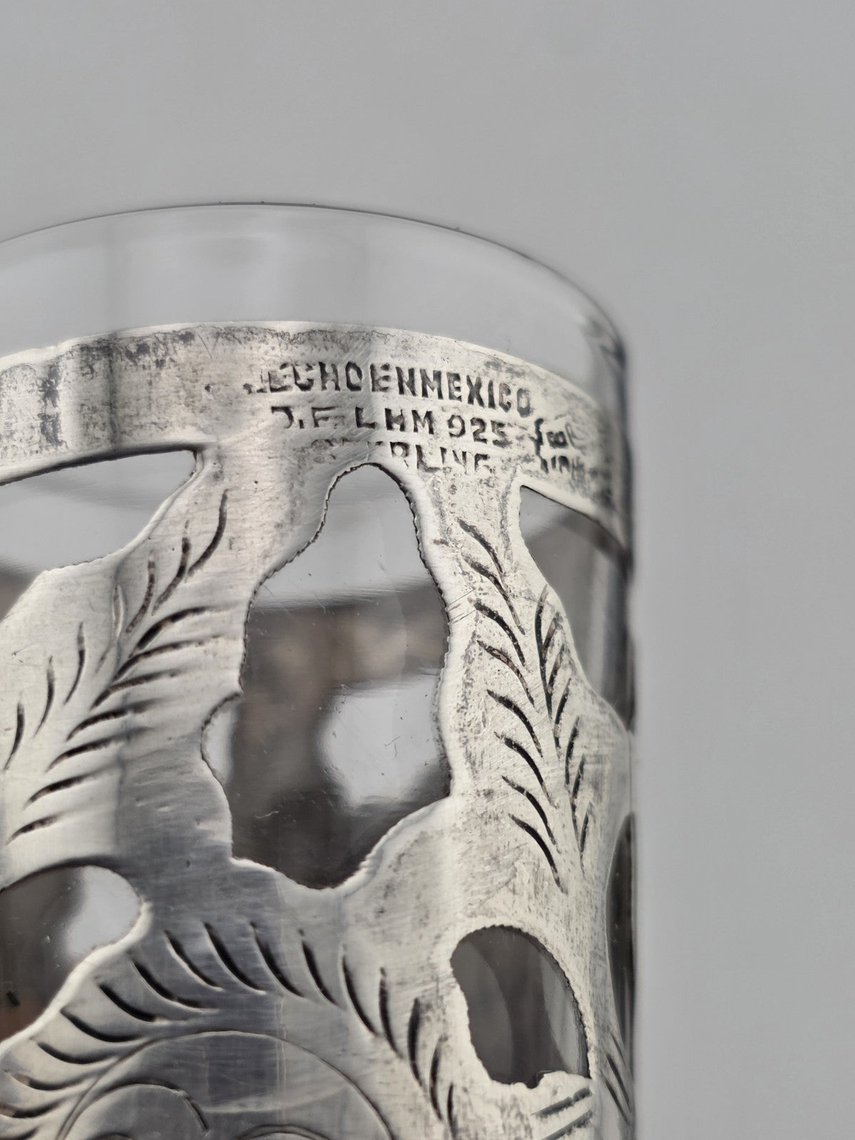 xThis set of 6 mid-century Mexico sterling silver 3.5" pierced cordials with glass liners features a floral pattern in a Victorian style. Crafted by Elkmenc, these elegant cups were made between 1900-1940 with sterling silver composition (.925). Ideal for collectors of antique silverware, this set brings a touch of vintage charm to any dining experience or special occasion.