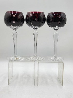 xThis set of 6 vintage Ajka Marsala Ruby Red cut to clear crystal hock wine glasses features a star pattern etched on the glass, adding an Art Deco style to the elegant design. Made in the 1960s, these wine glasses are of original production and studio crafted with a Crystal Clear brand. The rich red color and crystal material make them a beautiful addition to any drinkware collection, suitable for teens and unisex adults alike. Perfect for special occasions or everyday use, these wine glasses are sure to impress with their unique vintage charm.