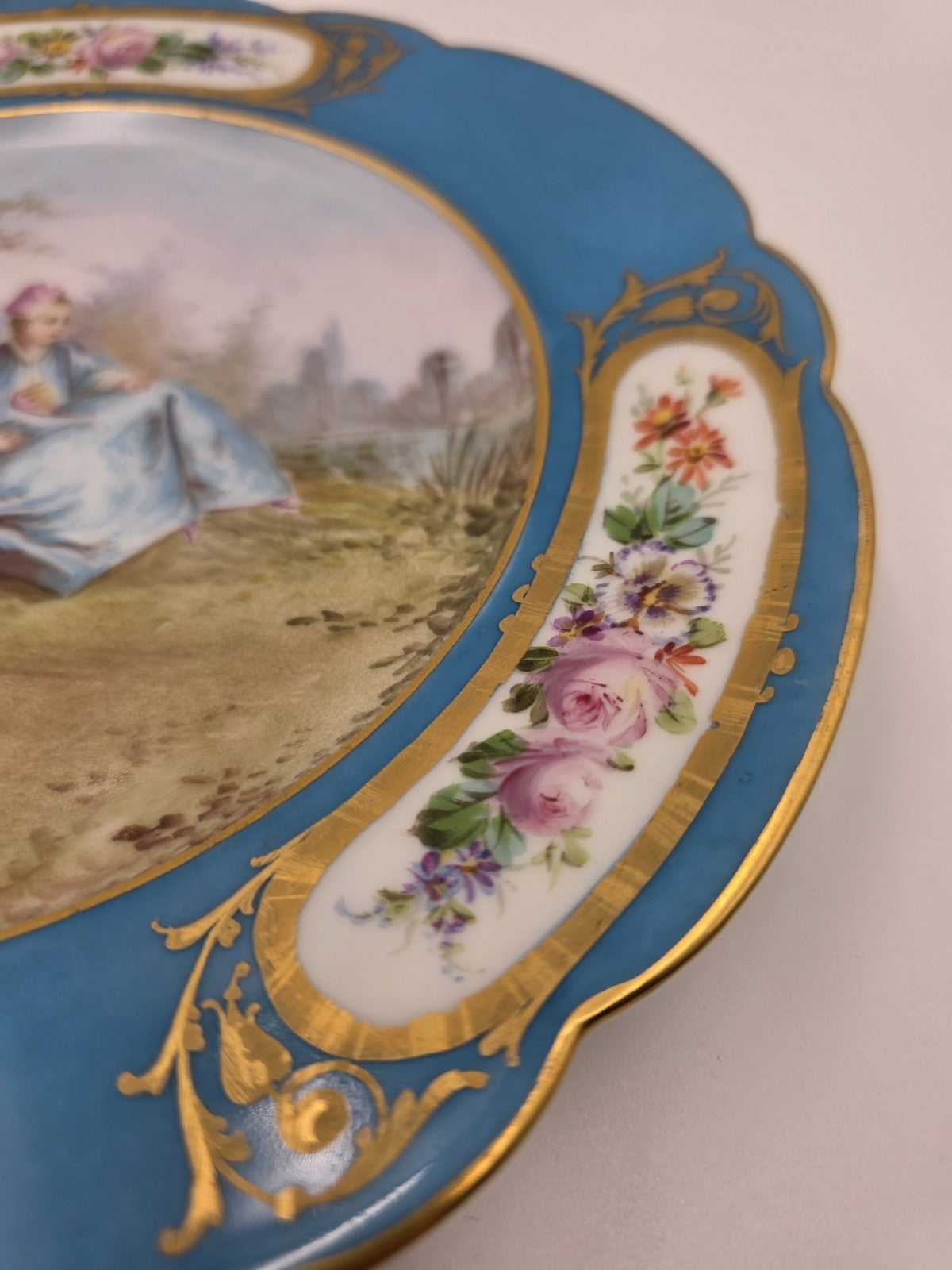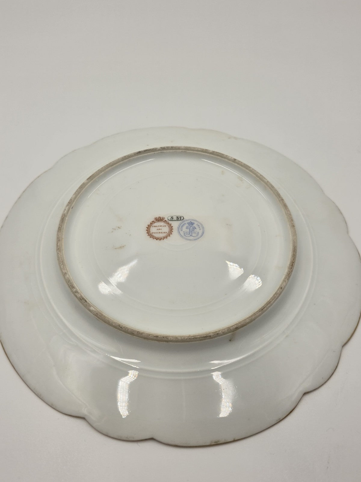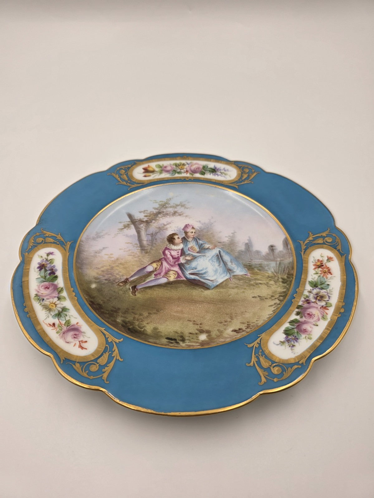 xThis stunning rare 1844 Sevres Chateau des Tuilleries Plate features a courtship couple design in a gold tone, showcasing exquisite craftsmanship from Paris. The porcelain plate, now in its vintage condition, serves as a beautiful decorative piece that adds a touch of elegance to any occasion. Handmade with an art pottery production style, this unique collectible item from France captures the essence of the early 19th century with its intricate courting couple theme. A true gem for collectors and enthusiasts of decorative cookware and serveware.