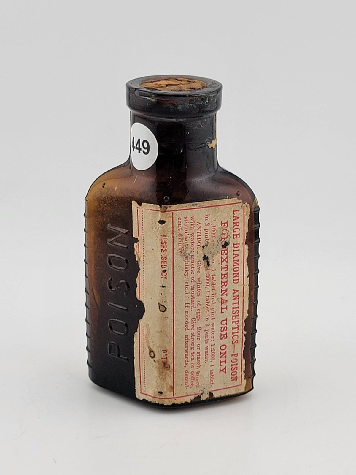 xThis product is a very rare antique poison diamond antiseptics medicine bottle with its original label. Made in the United States, this 2 oz. brown bottle features a unique poison design, making it a highly sought-after collectible item. With its historical significance and distinct appearance, this bottle is sure to be a valuable addition to any collection of antique bottles or medical memorabilia.