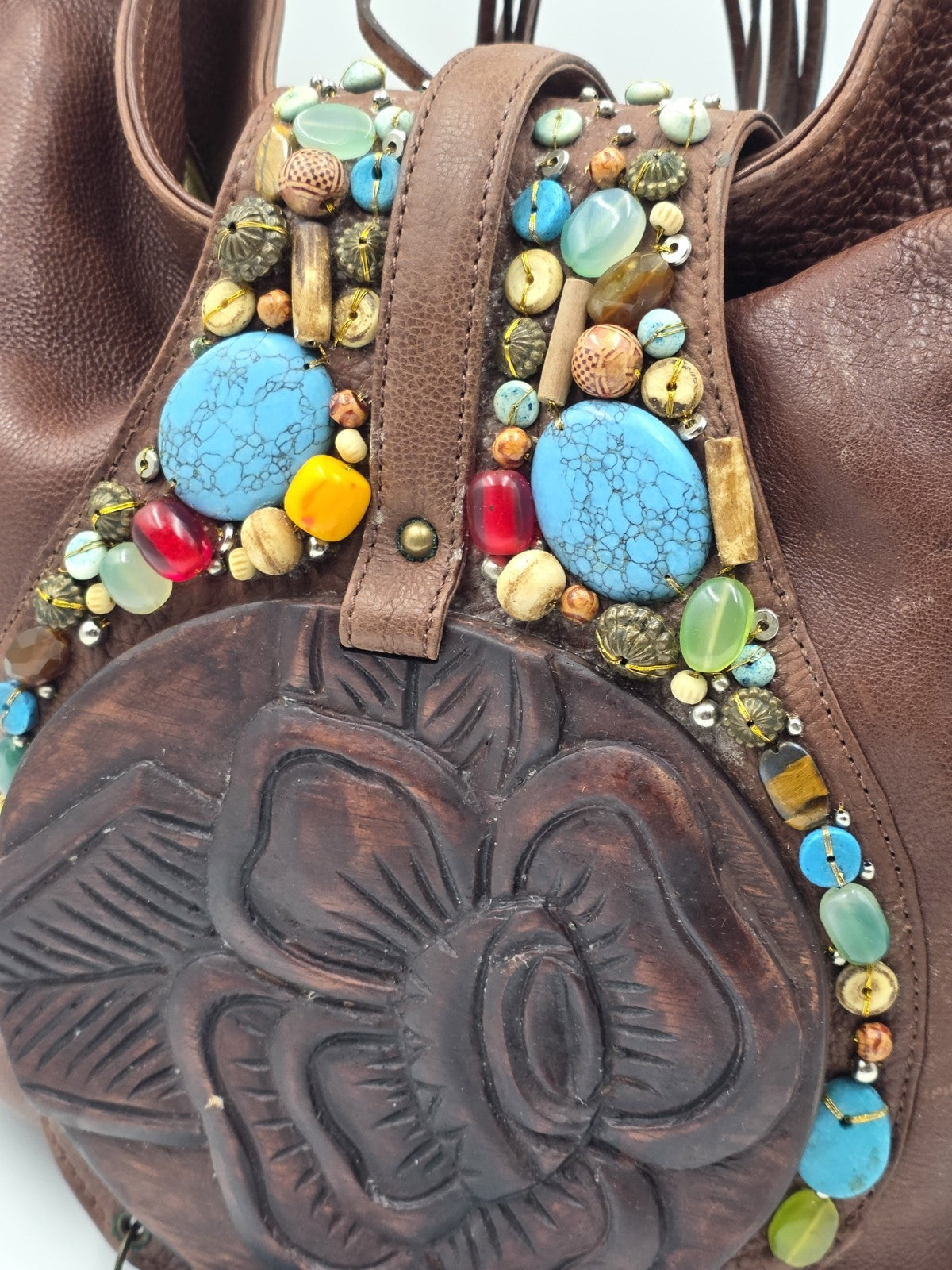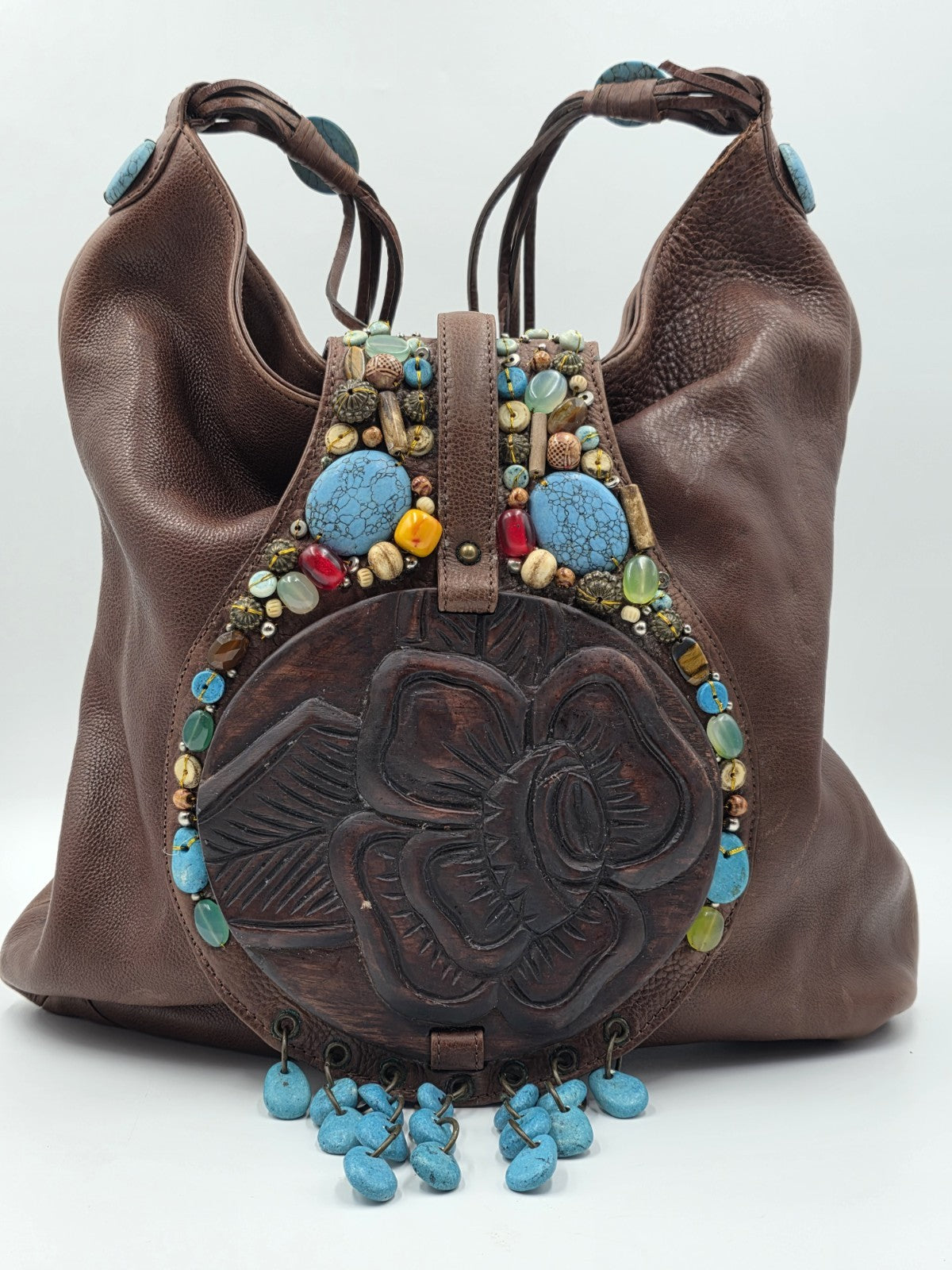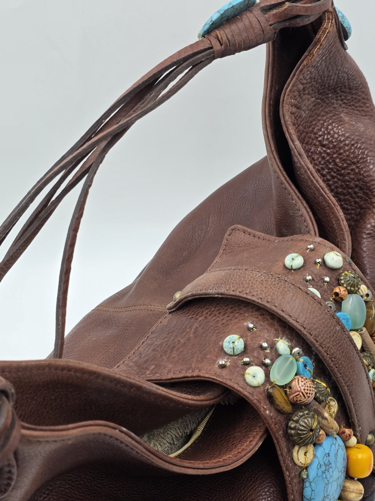 xThe Vintage Cole Haan G Series Brown Leather Native American Style Large Hobo Bag is a stylish and spacious tote designed for women. Made of high-quality leather with a fabric lining, this bag features a unique all-over pattern and multicolor hardware accents. The vintage Cole Haan branding adds a touch of nostalgia to this classic and versatile accessory, making it perfect for everyday use. With a button closure and brown leather handles, this bag is both functional and fashionable, perfect for any woman looking to add a touch of vintage flair to her wardrobe.