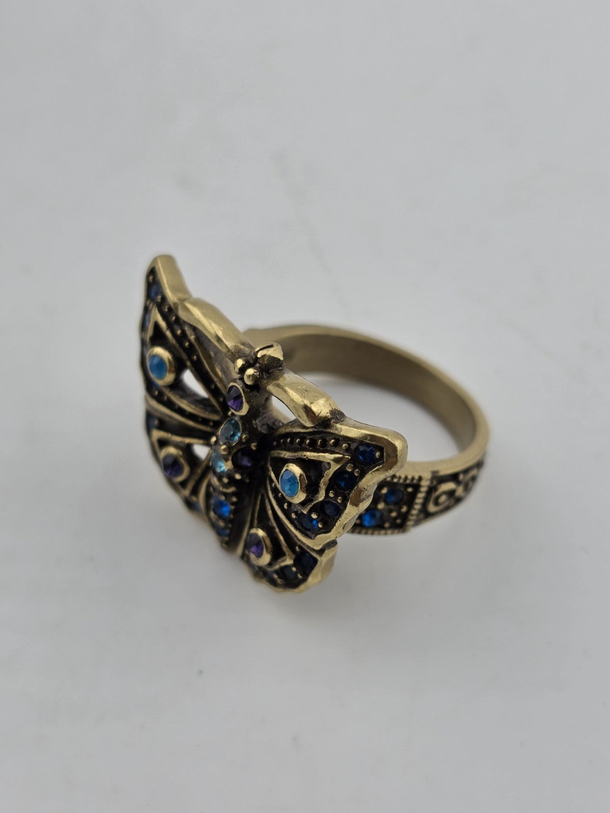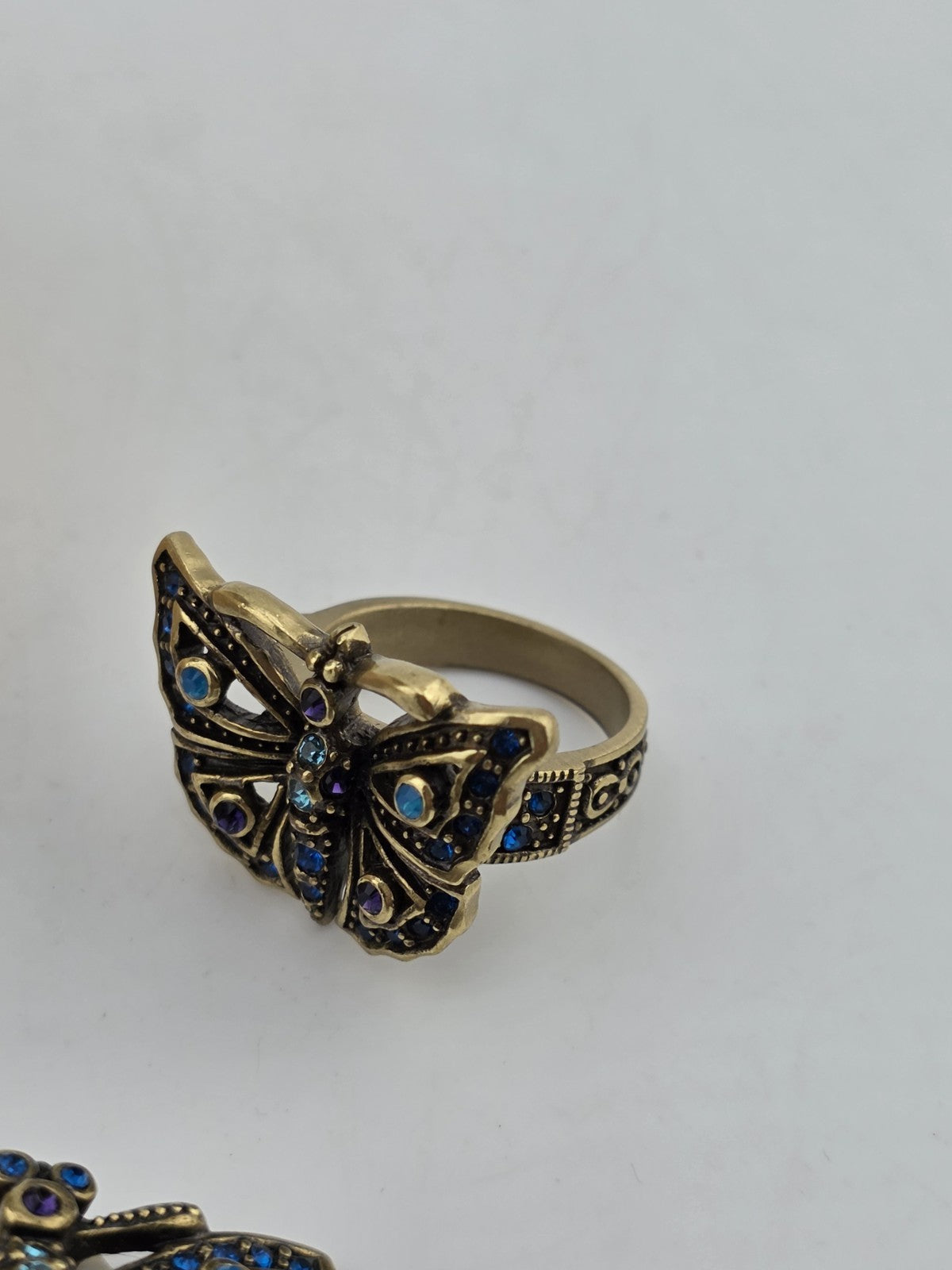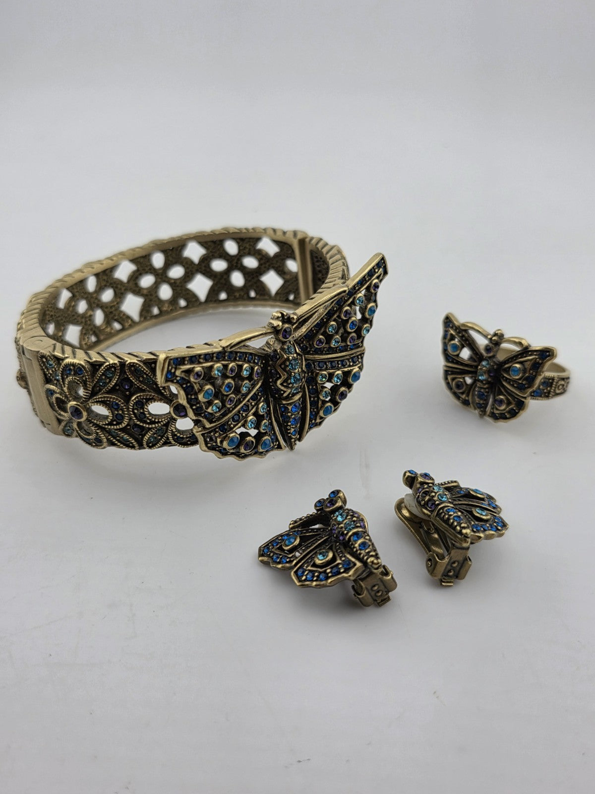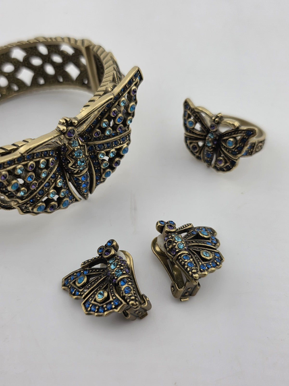 xThe Vintage Heidi Daus Butterfly Garden Crystal Set features a multicolor cuff bracelet, ring, and earrings adorned with crystals. This set embodies a whimsical and elegant style, perfect for adding a touch of sophistication to any outfit. With the brand's reputation for quality and attention to detail, this set is sure to make a statement with its beautiful design and intricate crystal detailing.