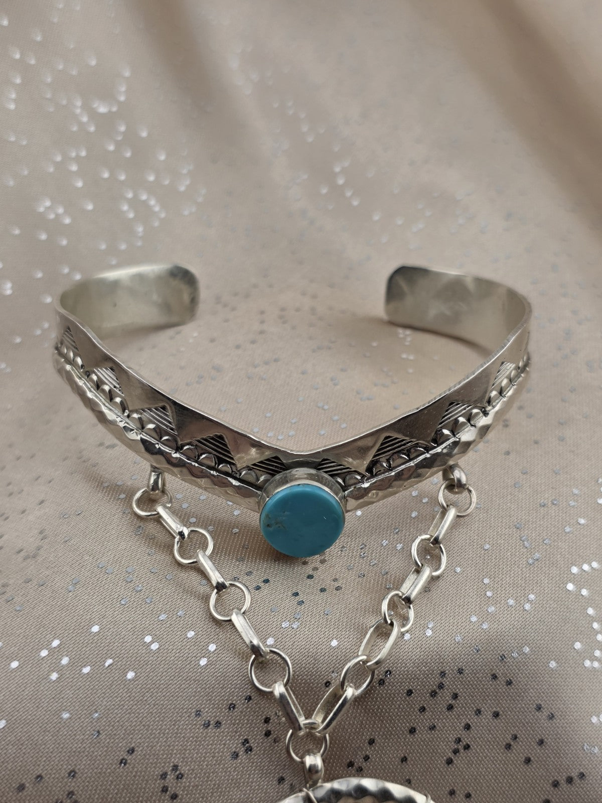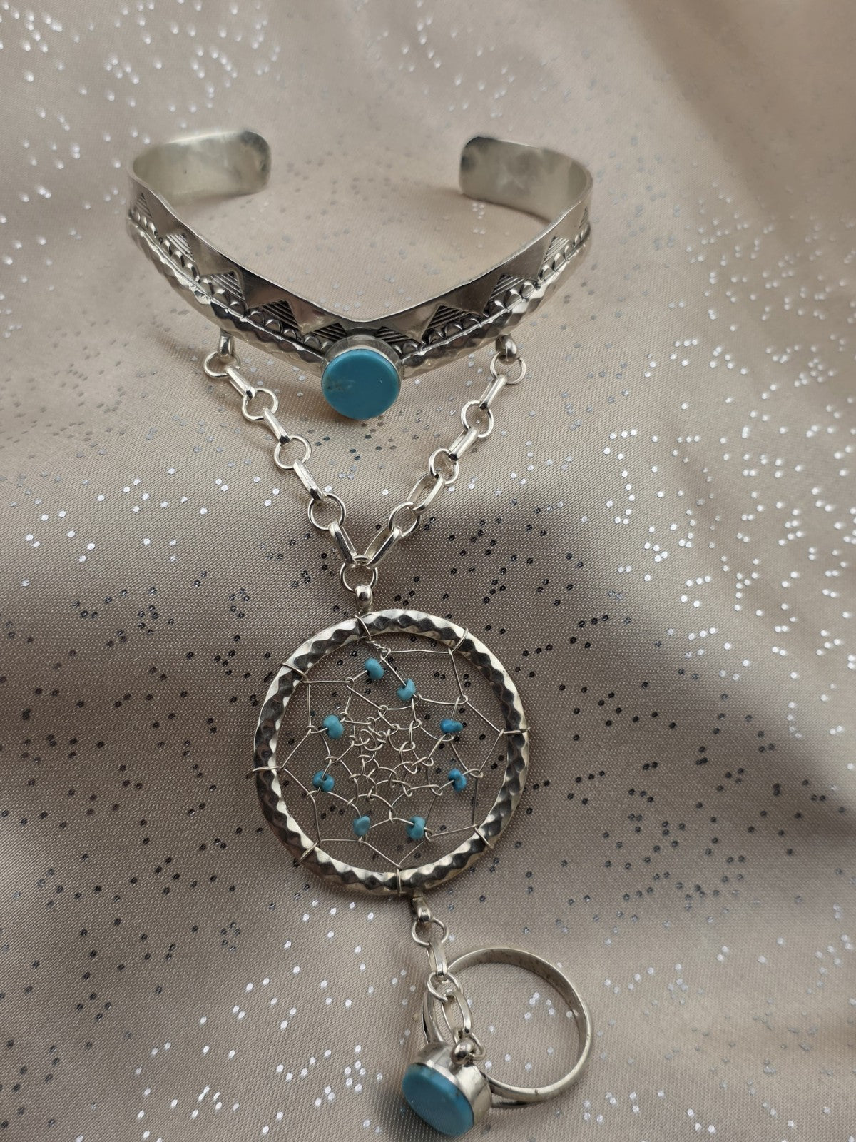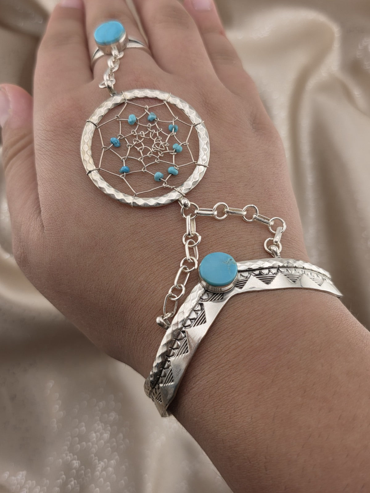 xThe Vintage RB 925 Sterling Silver Turquoise Hand Chain Slave Bracelet is a handmade piece of Native American jewelry from the Navajo tribe, originating from the United States. This Southwestern bracelet showcases traditional Native American craftsmanship and design, making it a unique and culturally significant collectible item. The use of turquoise in the piece adds an additional element of symbolism and beauty, reflecting the rich cultural heritage of the Native American people.