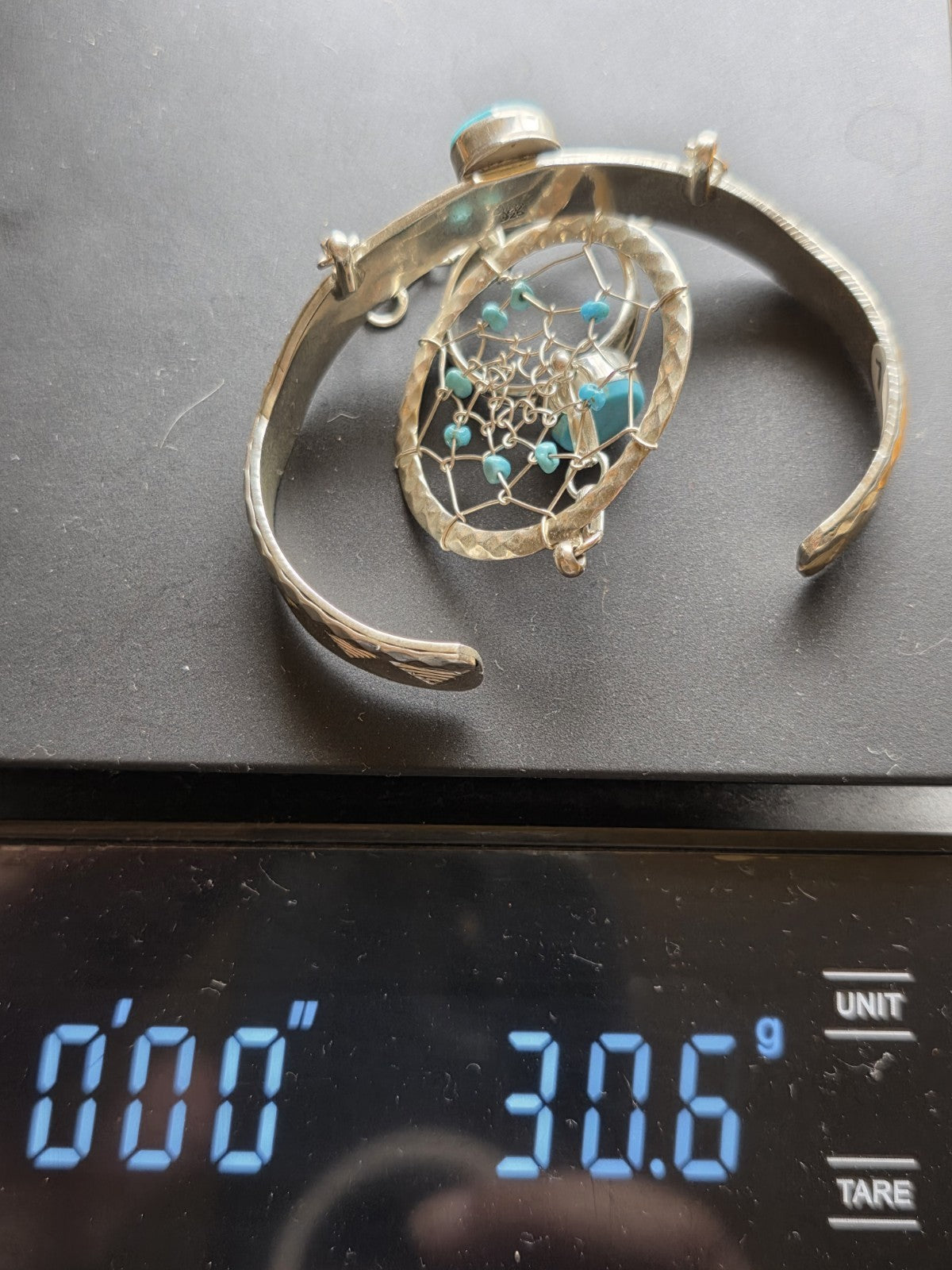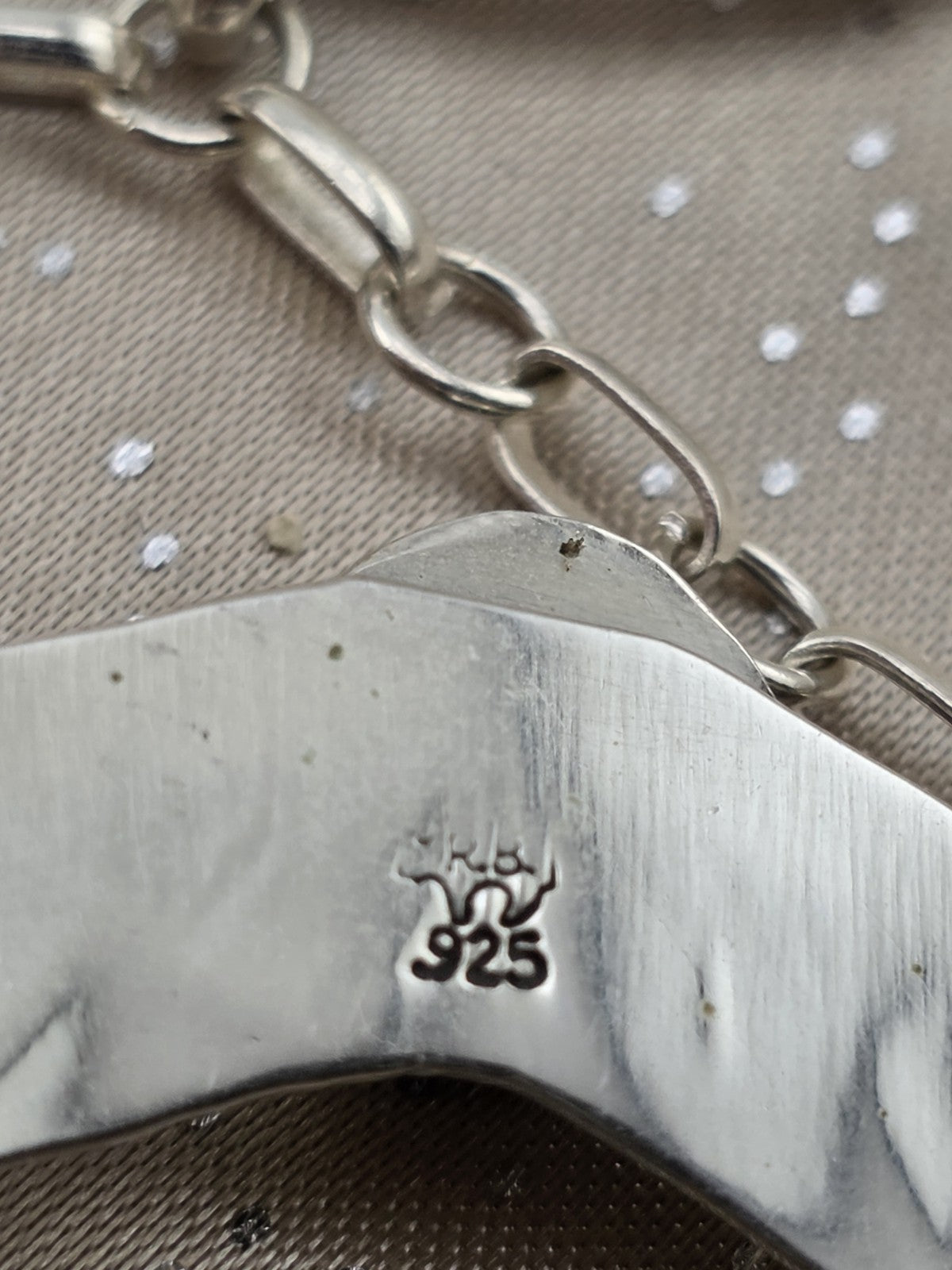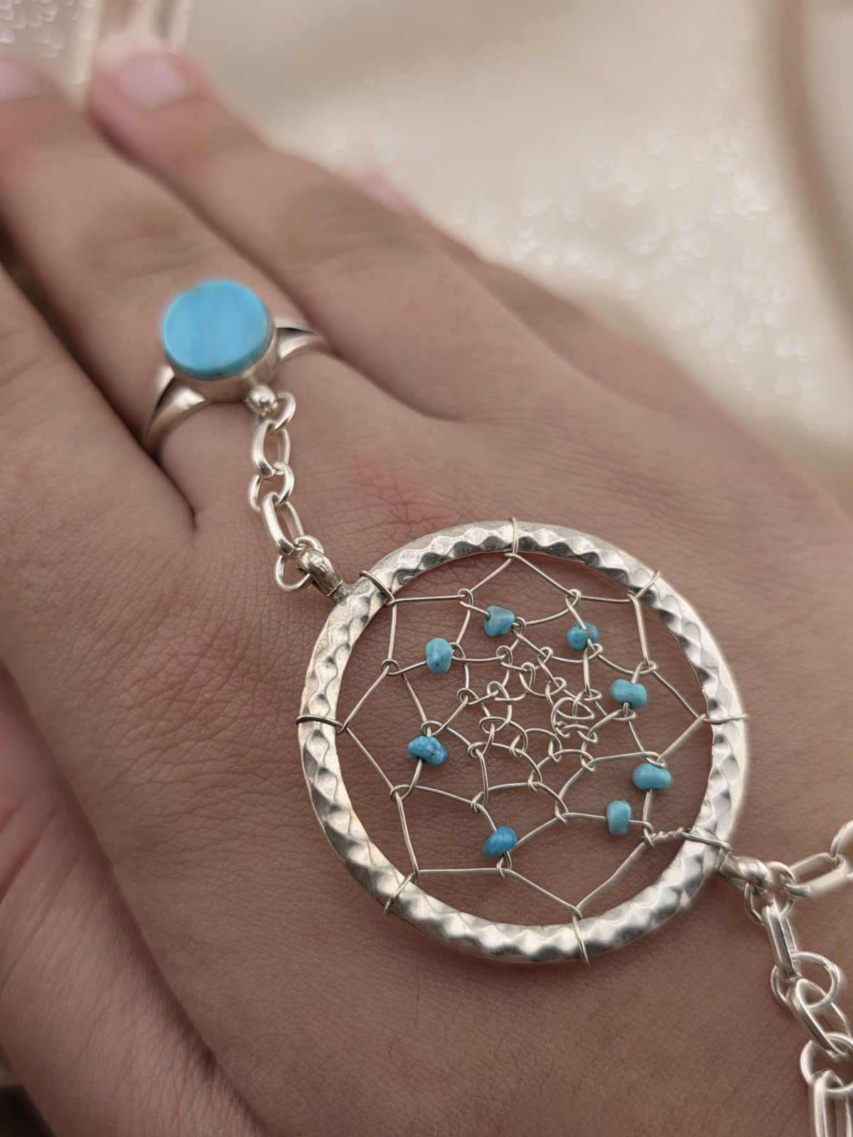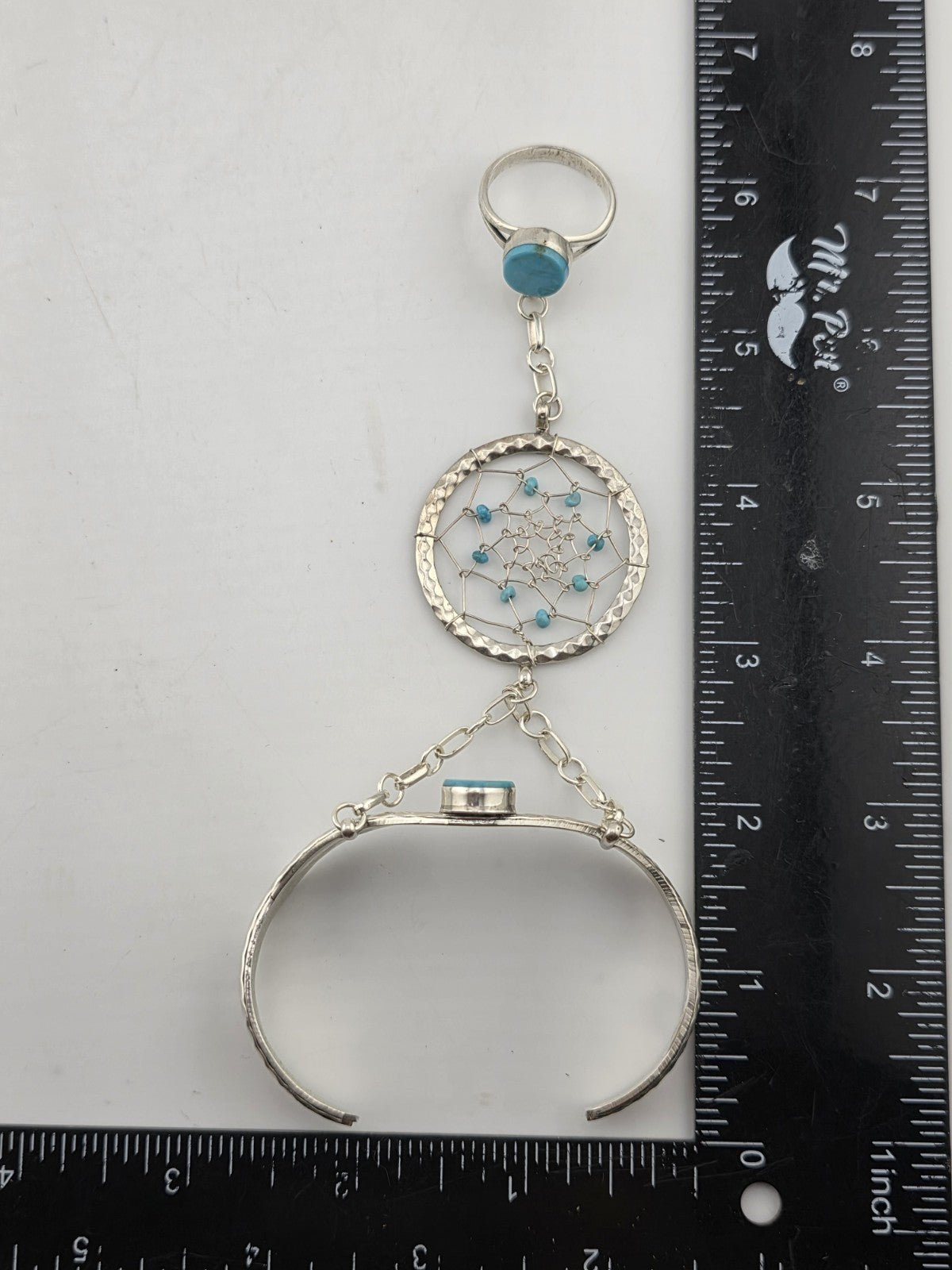 xThe Vintage RB 925 Sterling Silver Turquoise Hand Chain Slave Bracelet is a handmade piece of Native American jewelry from the Navajo tribe, originating from the United States. This Southwestern bracelet showcases traditional Native American craftsmanship and design, making it a unique and culturally significant collectible item. The use of turquoise in the piece adds an additional element of symbolism and beauty, reflecting the rich cultural heritage of the Native American people.