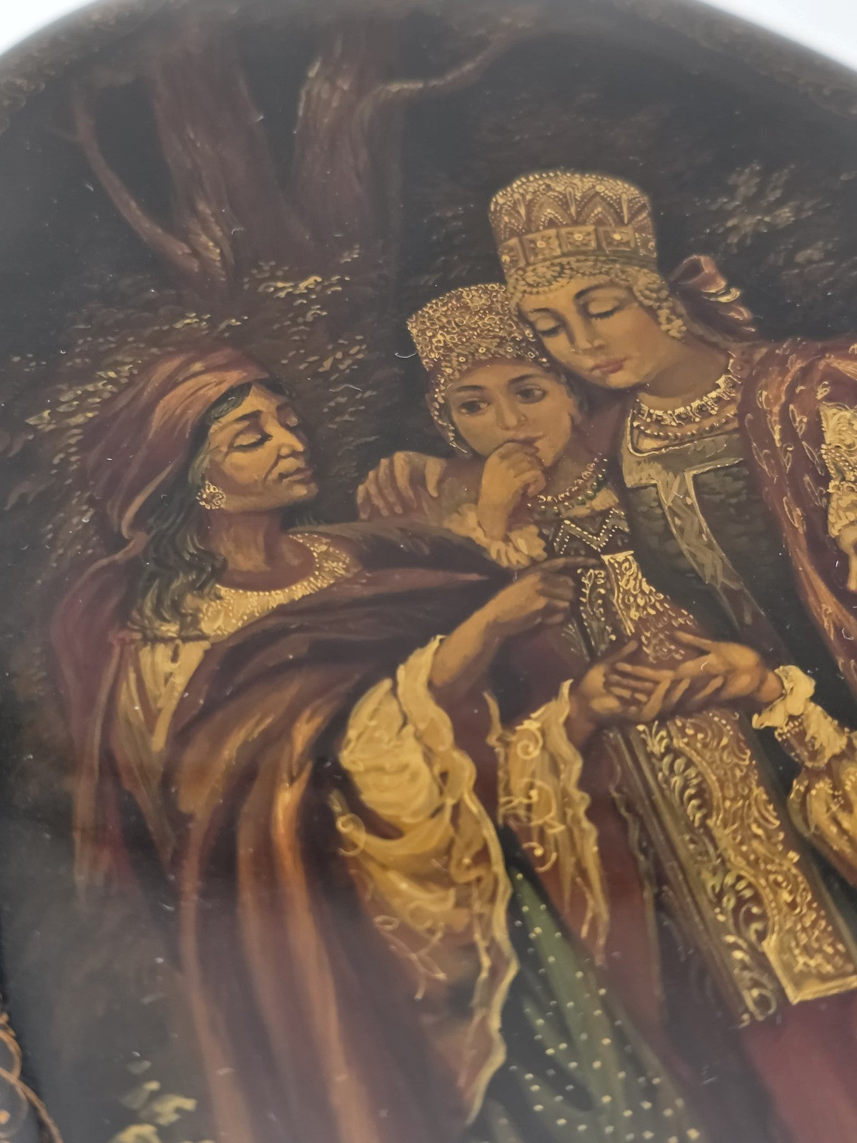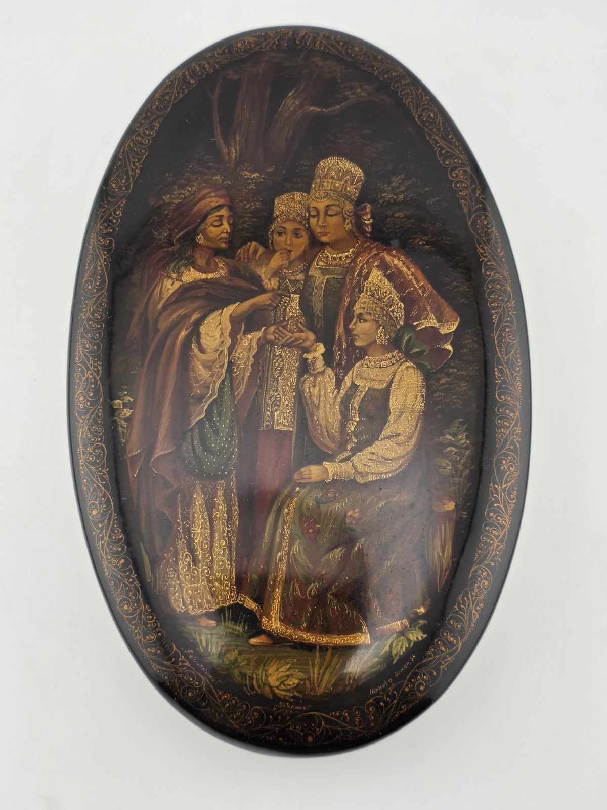 xThis Vintage Russian Fedoskino Lacquer Box is a handmade piece of folk art jewelry, featuring intricate hand-painted designs and a classic oval shape. Signed by the artist, this piece originates from the Russian Federation and reflects the rich cultural heritage of the region. Perfect for collectors or those who appreciate unique, one-of-a-kind items, this lacquer box is a beautiful representation of Russian craftsmanship and artistry.