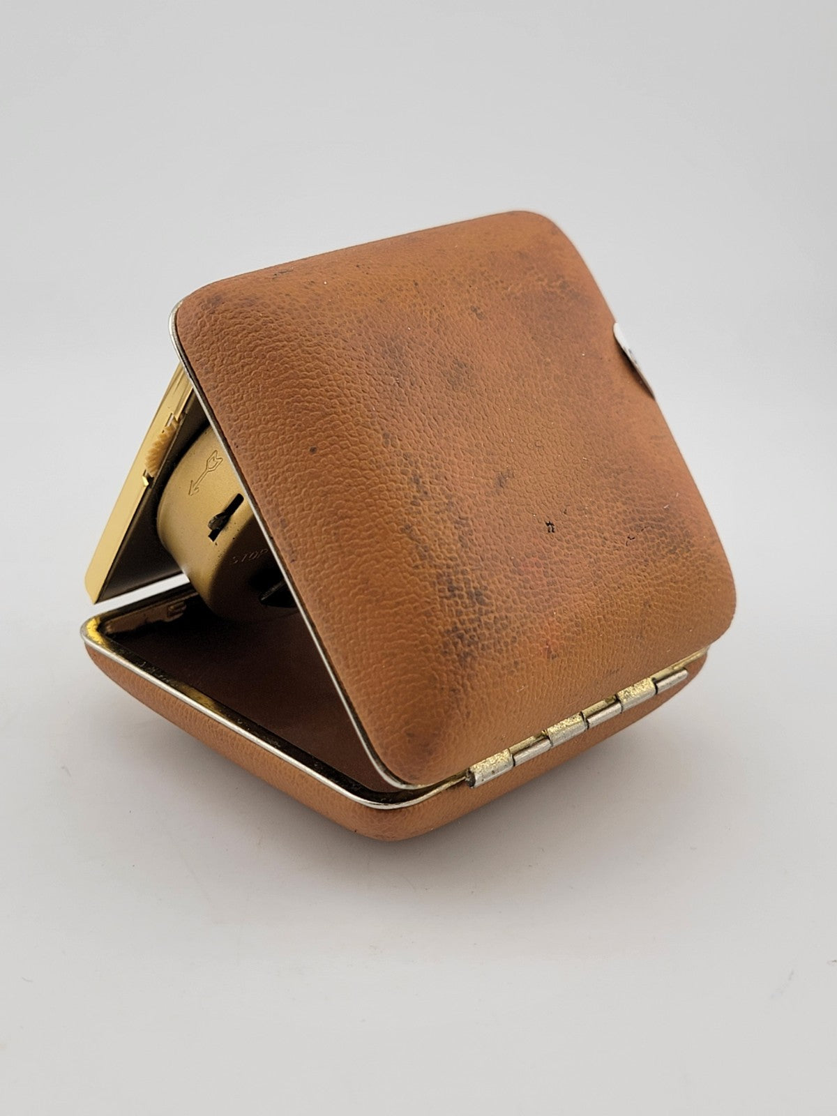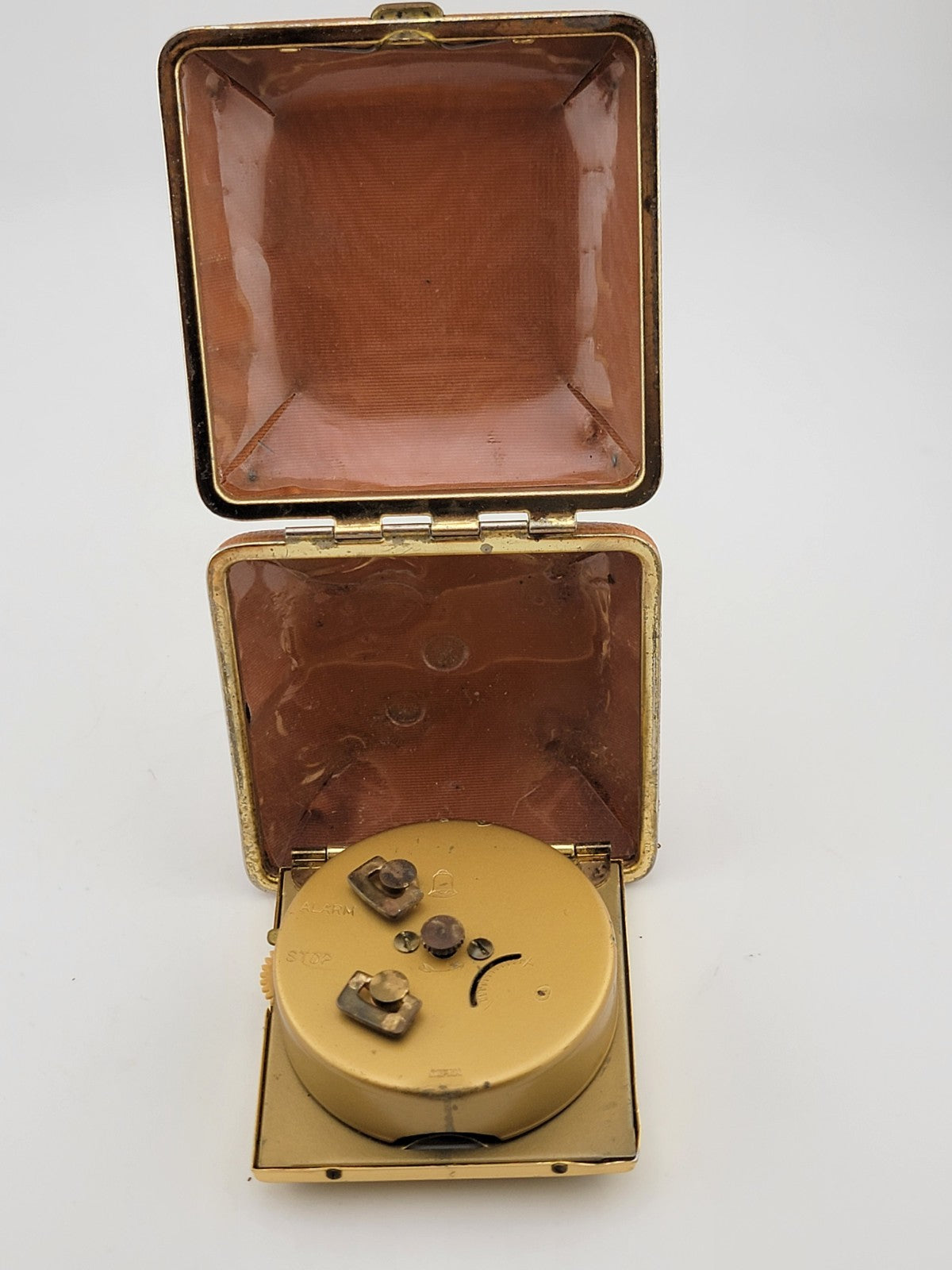xThis vintage 1960's Phinney-Walker desk alarm clock features a brown square case with a white face and Arabic numerals. It is a mechanical wind-up alarm clock with a retro style and vintage charm. The clock includes features such as wind-up power, keys, winders, and an alarm function. Made of plastic and metal, this collectible piece from the 1960s is a unique addition to any decor or clock collection. The clock measures 3 inches in length and width, with a brass frame material and a white finish.