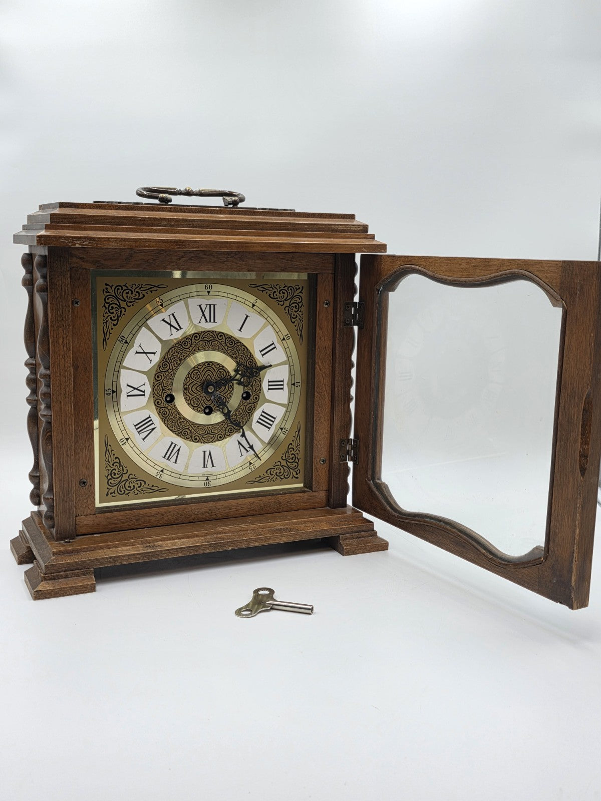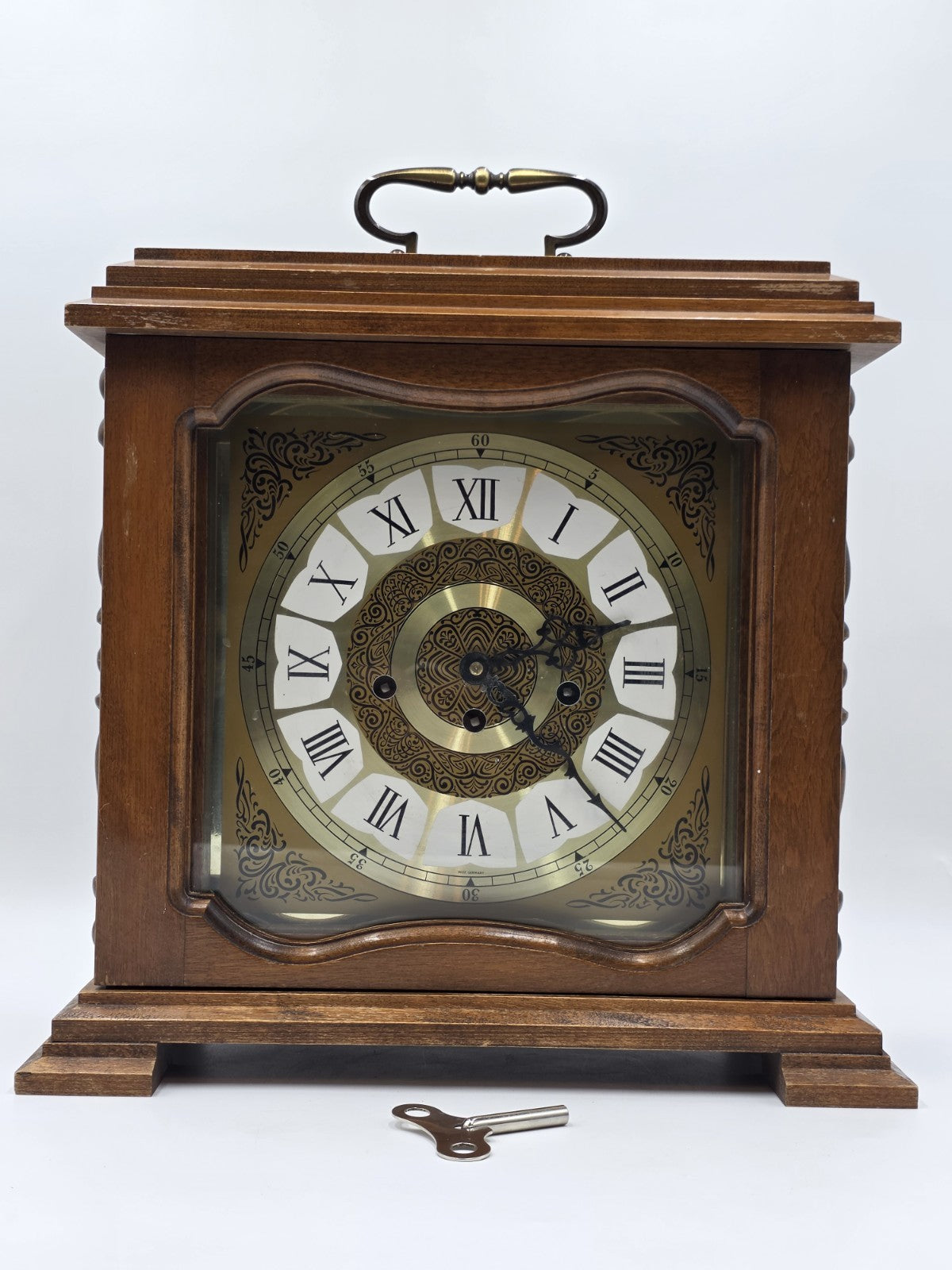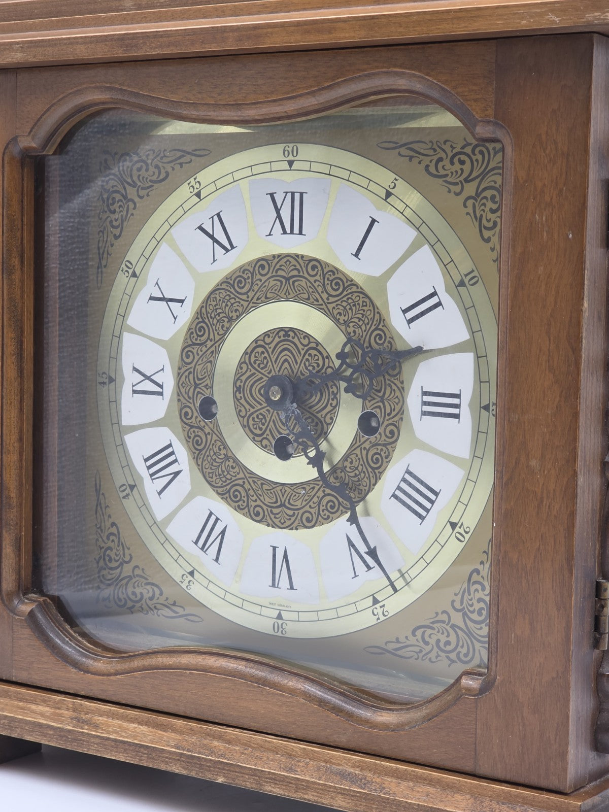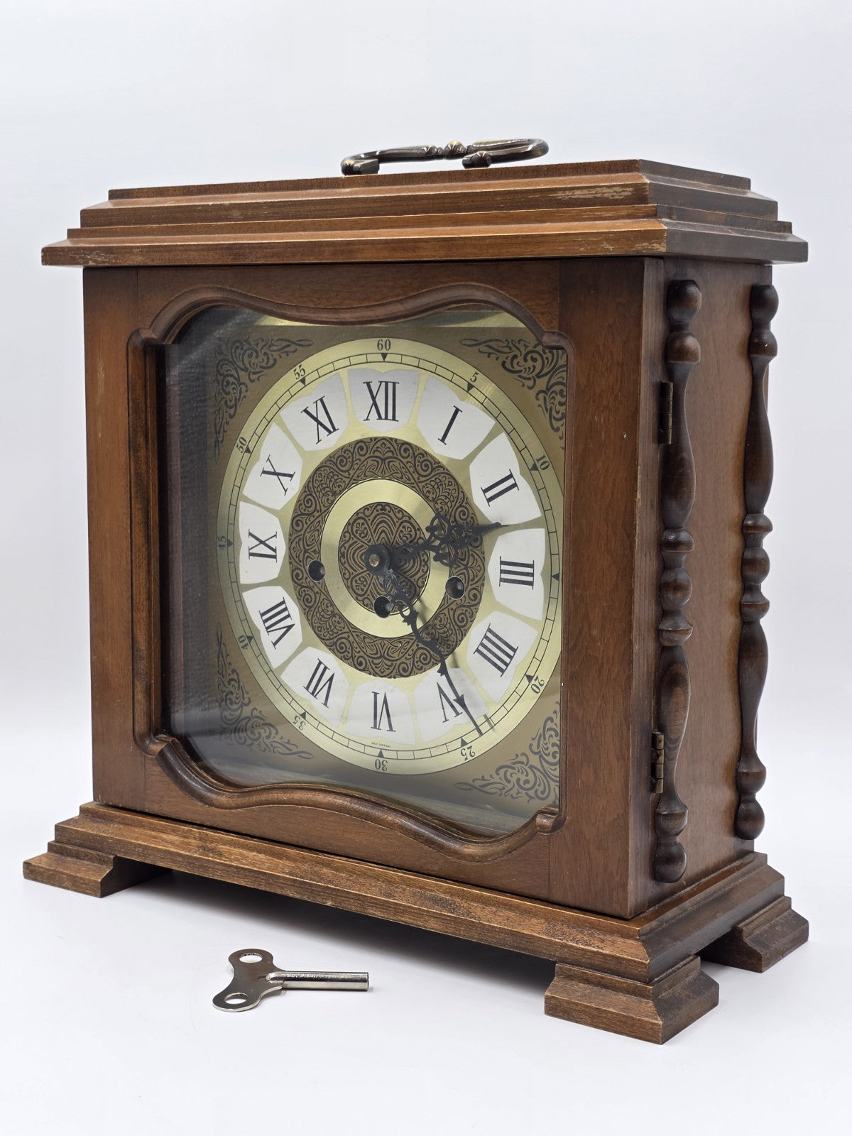 xThe product is a vintage Franz Hermle 340-020 mantel clock from West Germany, designed with a wind-up mechanical movement and featuring a Westminster chime sequence. This desk clock is made of wood, brass, and glass, with a walnut finish and brown color. With its retro design and 8-day power reserve, this late 20th-century clock is a unique and functional decorative collectible for collectors and vintage enthusiasts.