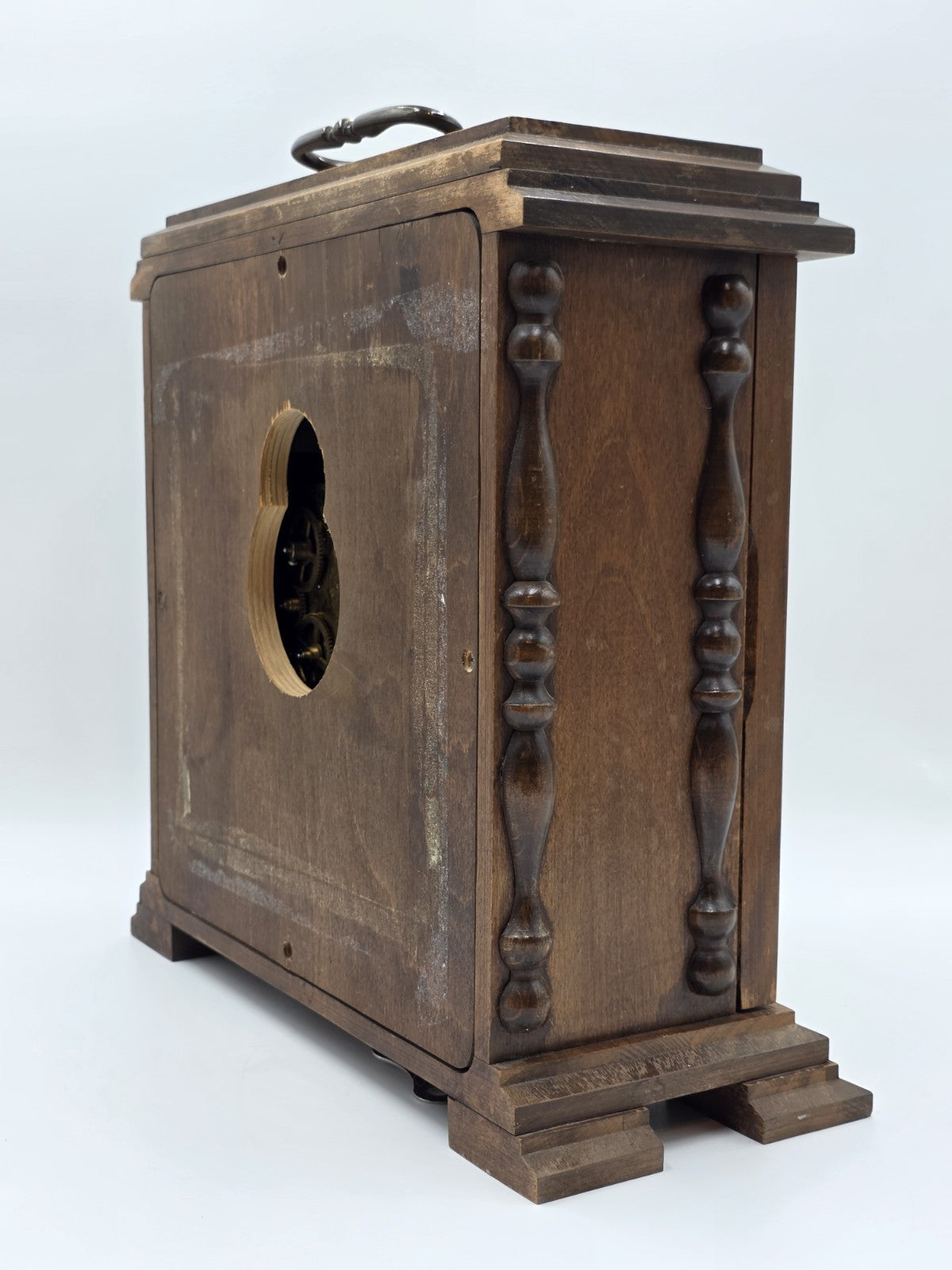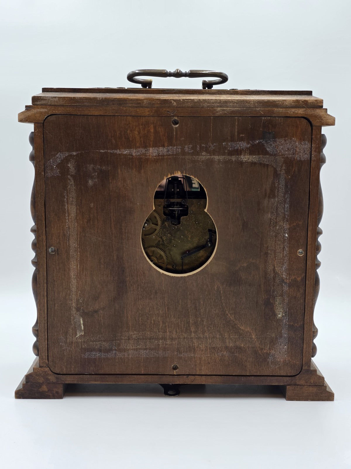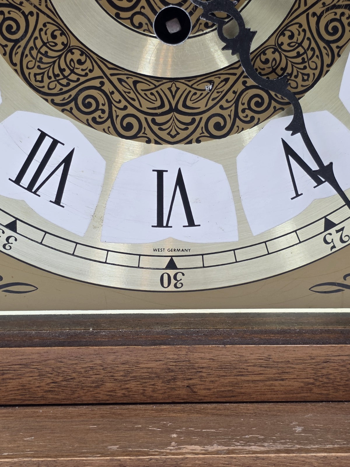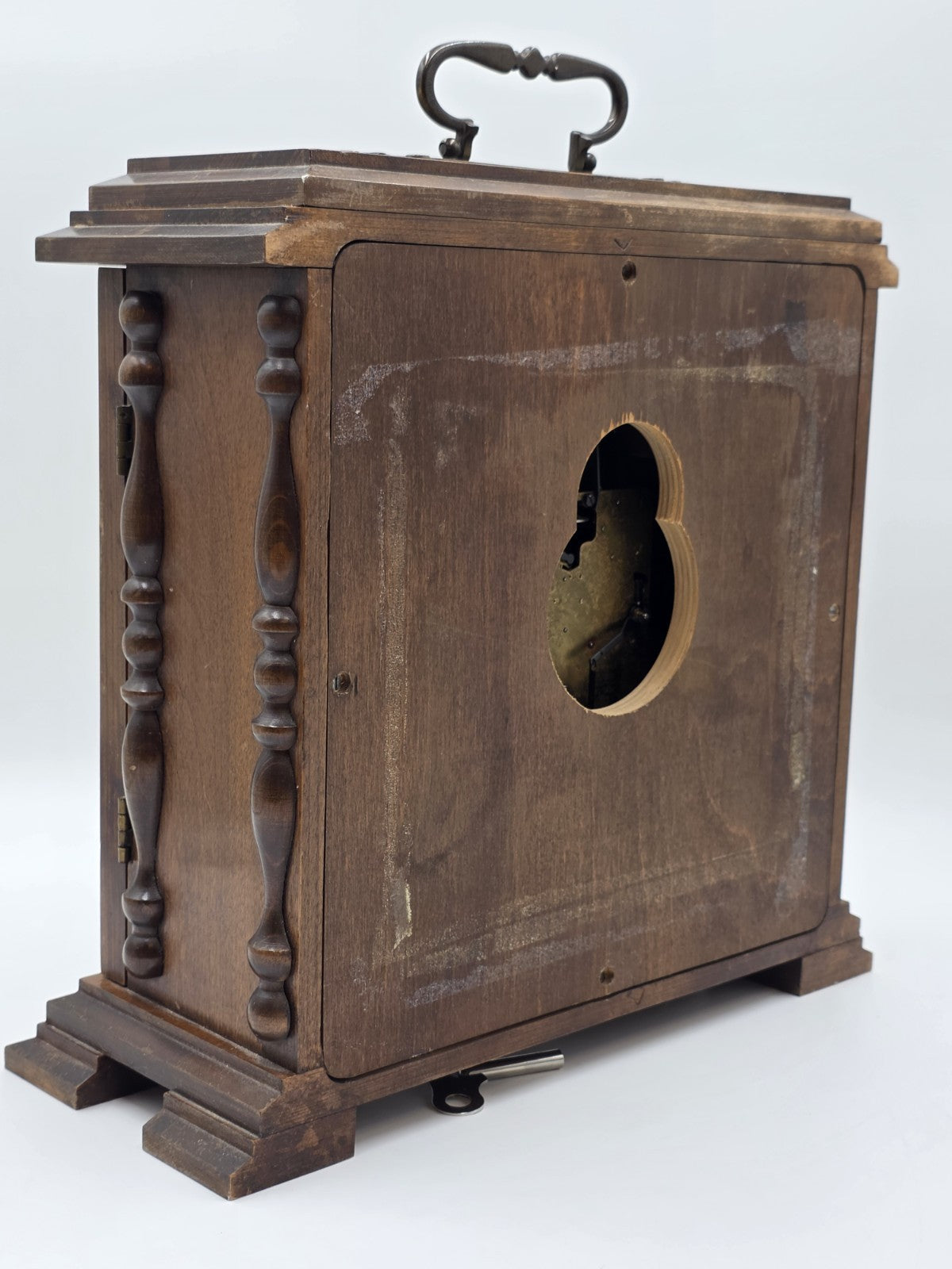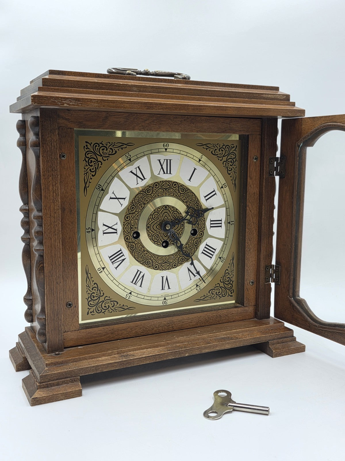 xThe product is a vintage Franz Hermle 340-020 mantel clock from West Germany, designed with a wind-up mechanical movement and featuring a Westminster chime sequence. This desk clock is made of wood, brass, and glass, with a walnut finish and brown color. With its retro design and 8-day power reserve, this late 20th-century clock is a unique and functional decorative collectible for collectors and vintage enthusiasts.