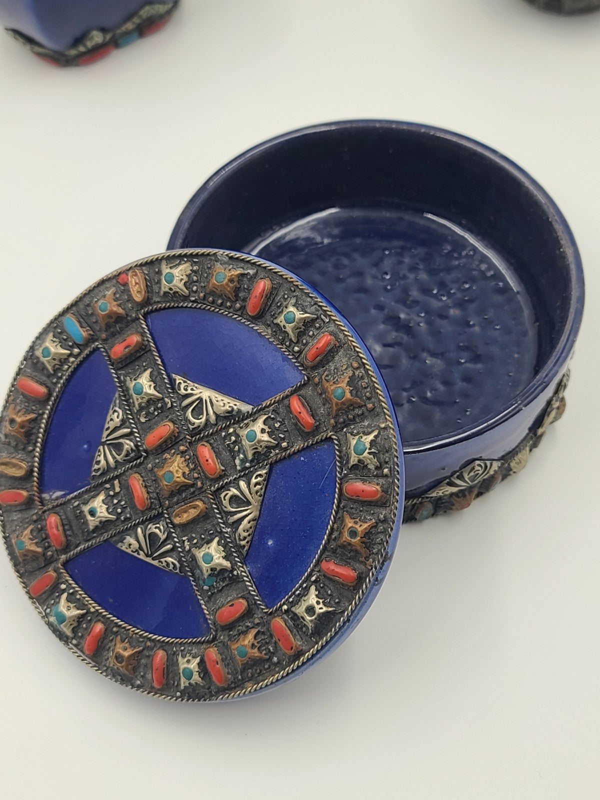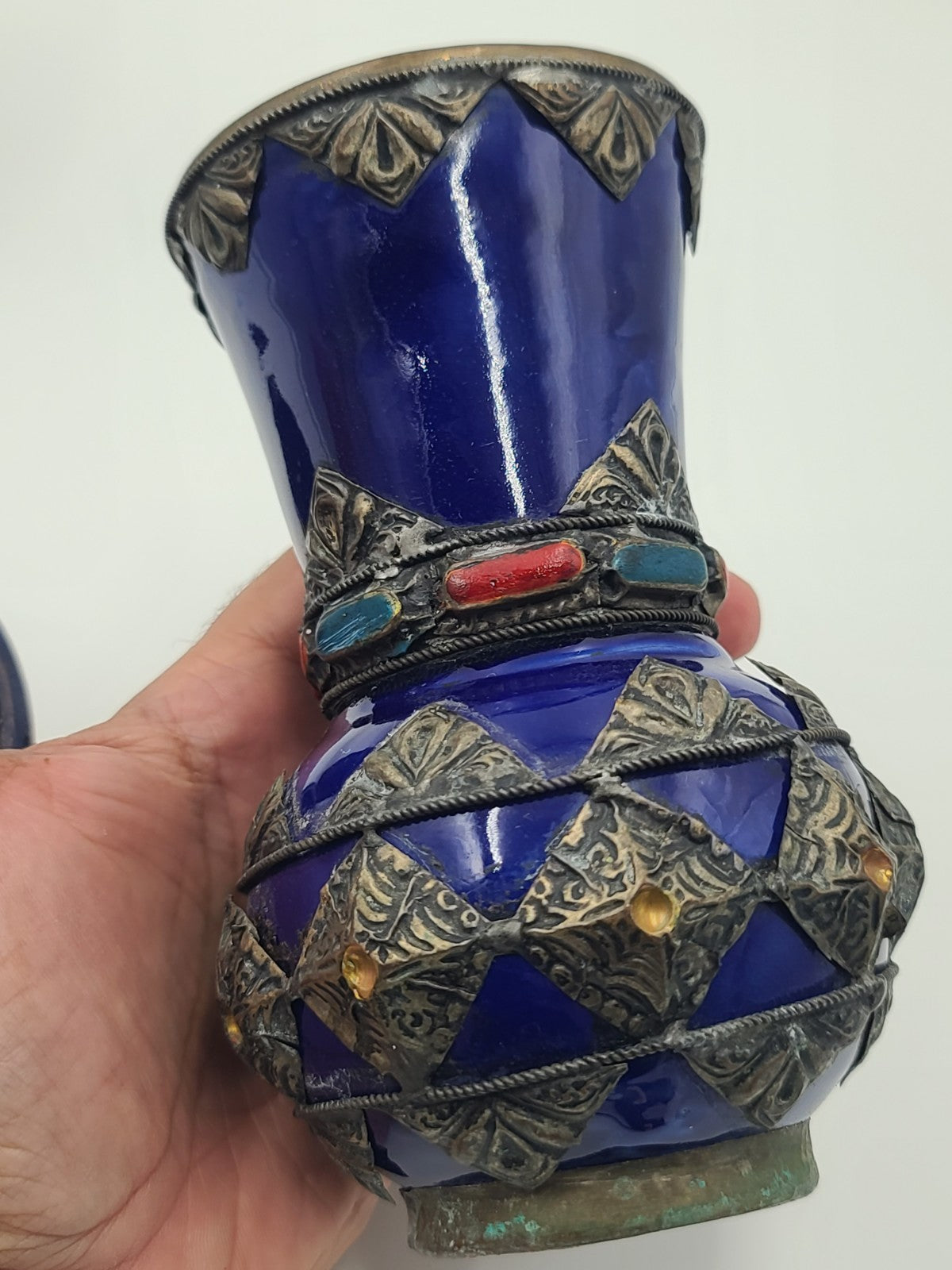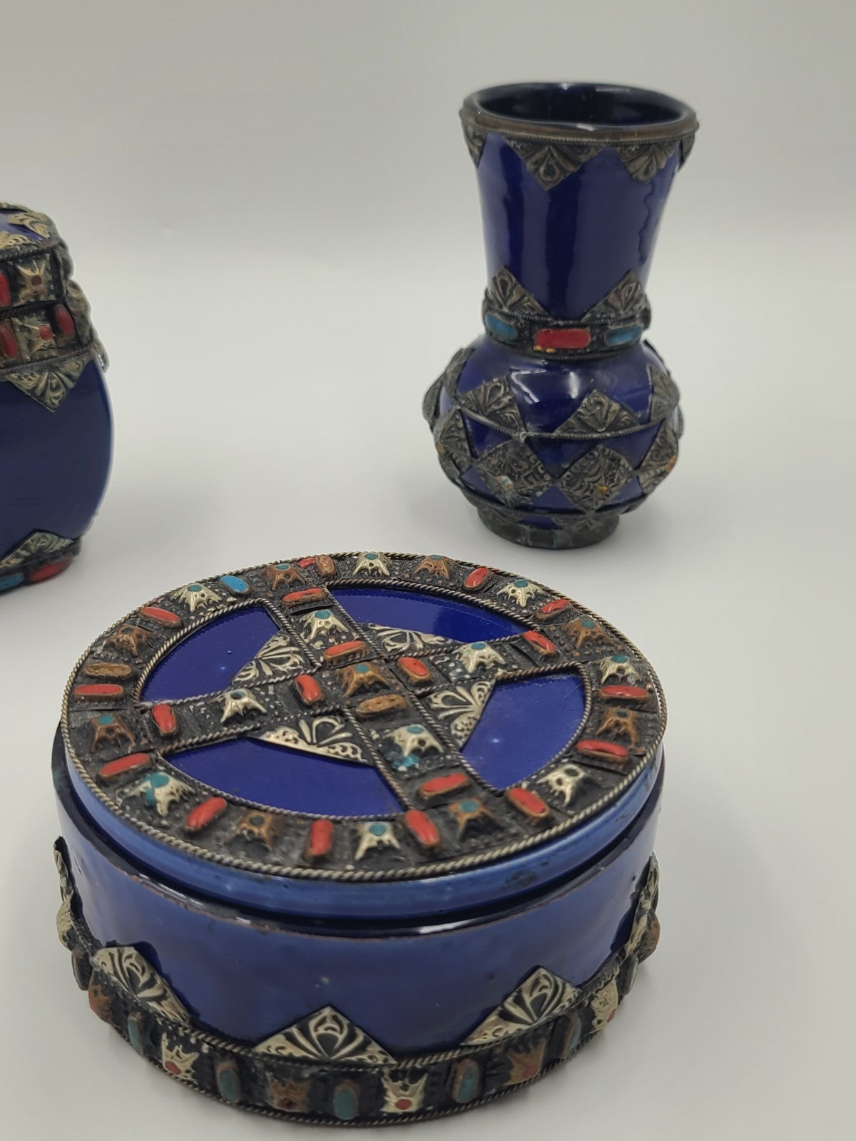 xThis vintage set of four cobalt ceramic vases with metal inlay features a stylish Moroccan Berber design from the 1970s. The small size and metallic finish add to the unique charm of these decorative pieces, perfect for teens and adults looking to add a touch of Moroccan flair to their space. Made in Morocco, these boxed vases bring an exotic and timeless feel to any room.
