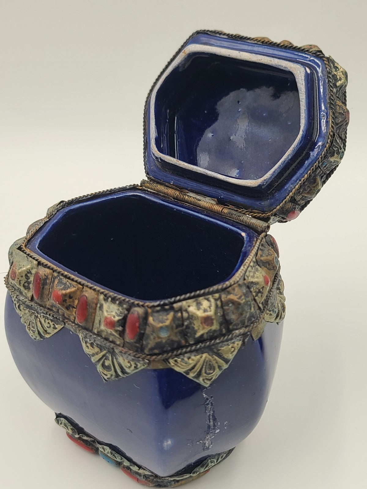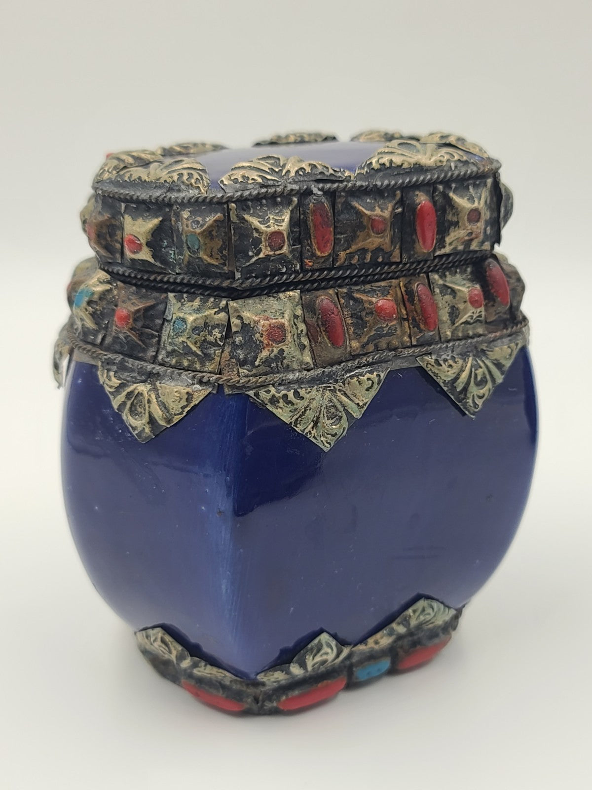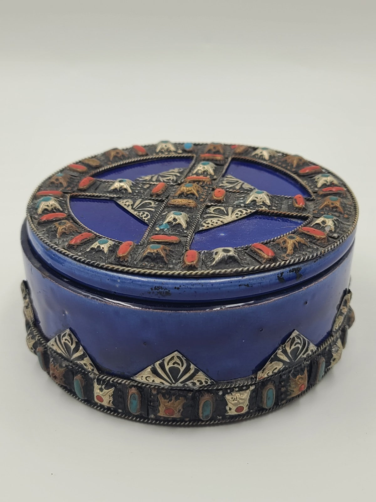 xThis vintage set of four cobalt ceramic vases with metal inlay features a stylish Moroccan Berber design from the 1970s. The small size and metallic finish add to the unique charm of these decorative pieces, perfect for teens and adults looking to add a touch of Moroccan flair to their space. Made in Morocco, these boxed vases bring an exotic and timeless feel to any room.
